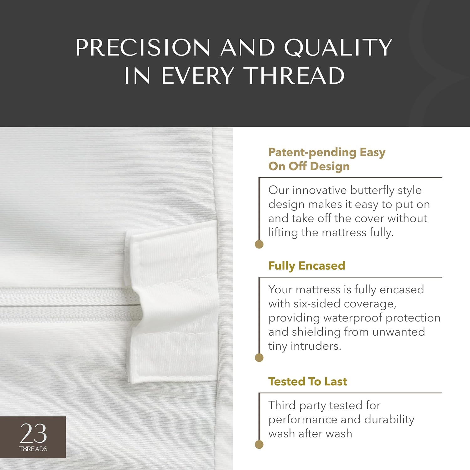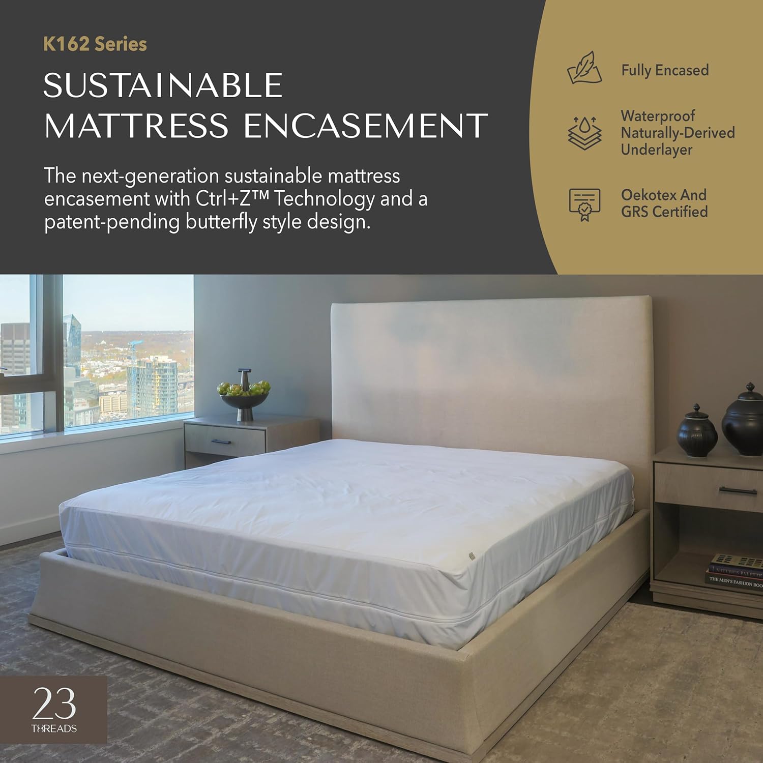 Experience the perfect blend of comfort and protection with our 23 THREADS K162 Series Waterproof Mattress Encasement. This innovative encasement is designed to safeguard your mattress from dirt, dust mites, spills, and moisture, ensuring a clean, hygienic sleep environment. The seamless, six-sided construction guarantees complete coverage, while the noiseless design delivers uninterrupted rest. With its biodegradable properties thanks to Ctrl+Z Technology, it's a sustainable choice that aligns with eco-conscious values. Whether you're using a standard or reversible mattress, this encasement is versatile and easy to maintain. The patented butterfly-style zip makes installation and removal effortless, without the need to lift your mattress. It's also machine washable, making it simple to keep your sleep surface fresh and clean. GRS and Oekotex 100 certifications ensure that every detail of this product meets strict safety and ethical standards, making it a top choice for health and environmentally conscious buyers.Luxurious Waterproof Mattress Encasement