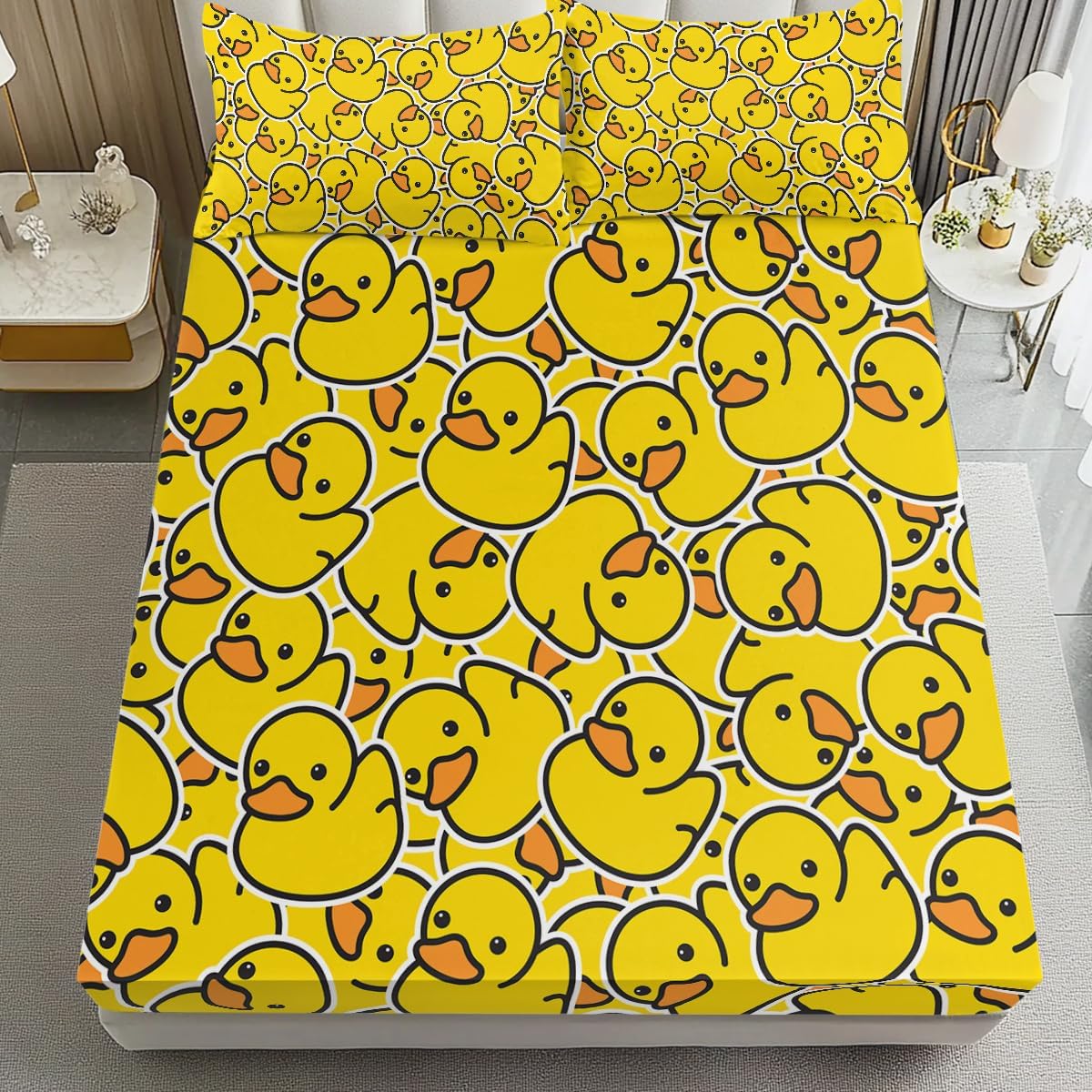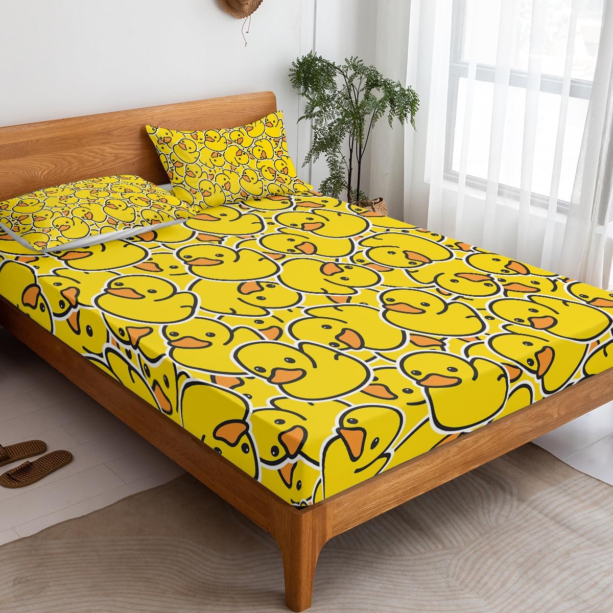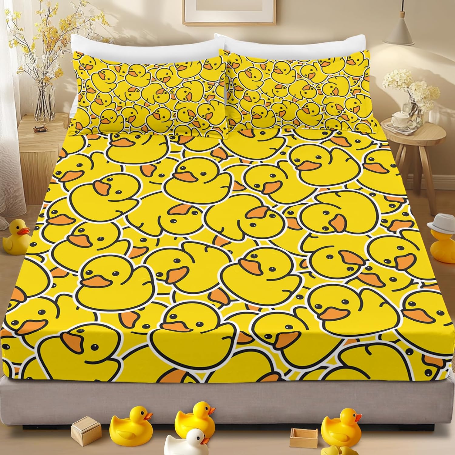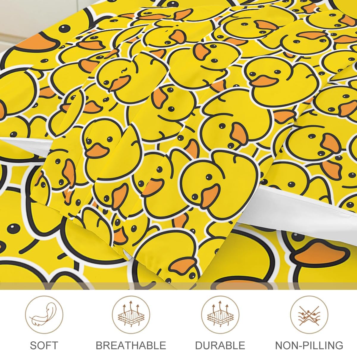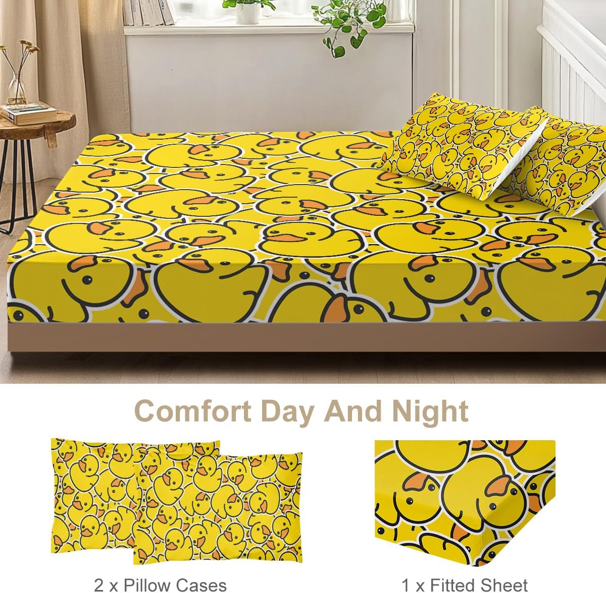Add a splash of fun and comfort to your child's bedroom with this adorable 3-piece bed sheet set. Designed specifically for kids, it features a fitted sheet and two matching pillowcases for complete bedding, while the bright yellow rubber duck design brings playful charm to any space.