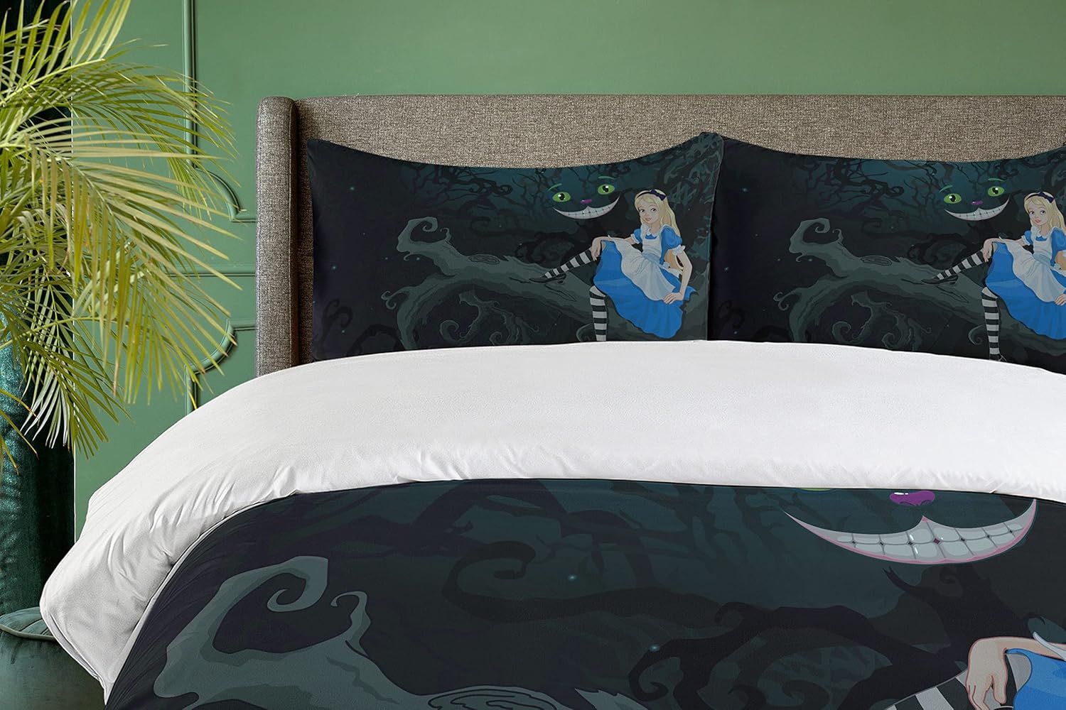 Transform your childâs room into a magical wonderland with this beautifully designed bedding set. Inspired by the beloved story, it adds a touch of creativity and charm to any bedroom décor. Crafted from 100% brushed microfiber, this set is incredibly soft to the touch and built to last. It provides a comfortable and cozy sleep environment while maintaining its vibrant colors through everyday use. The set features high-quality digital prints of Alice and the Cheshire Cat, bringing a whimsical and engaging aesthetic to your childâs space. Perfect for kids who love stories and imagination, this set is both entertaining and educational. Bed Size Compatibility: Designed for a California King bed, this set fits perfectly and offers a stunning visual display that captivates children and adults alike. Set Includes: One duvet cover (104" x 98") and two pillow shams (36" x 20") with all prints on the front side for maximum appeal. This set is designed for everyday use with a hidden zipper and envelope closures, making it simple to remove, clean, and store. It is machine washable and dryer safe, ensuring long-lasting performance without fading. Whether you're looking to enhance your childâs bedroom or gift a meaningful piece of décor, this Alice in Wonderland bedding set is an excellent choice. It combines quality craftsmanship with a timeless theme, giving your space a fun and magical upgrade.Alice in Wonderland Duvet Cover Set