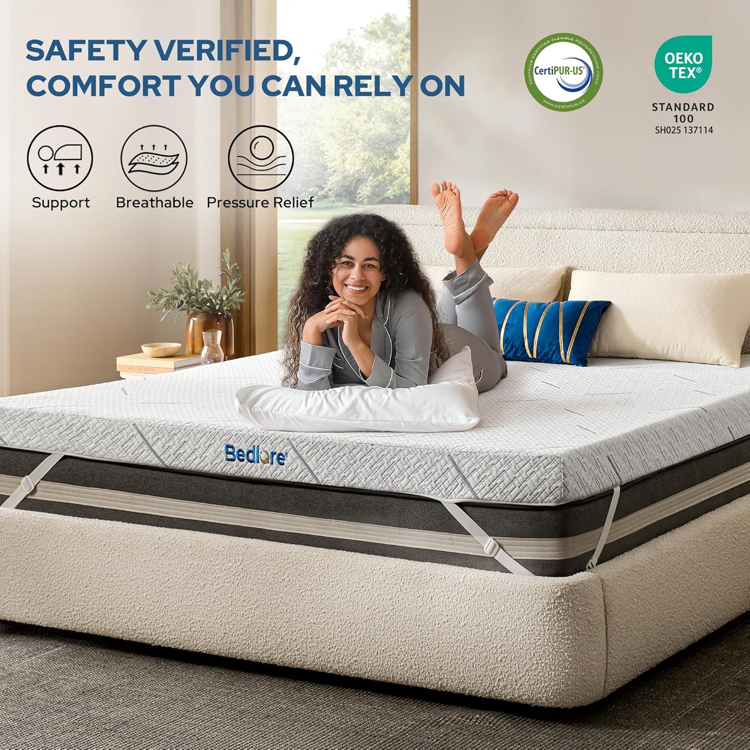 With CertiPUR-US and OEKO-TEX certifications, the BEDLORE mattress topper guarantees safe, chemical-free materials for a healthier sleep environment. Itâs an ideal upgrade for any mattress, offering both support and a luxurious feel without the hassle of frequent replacements.