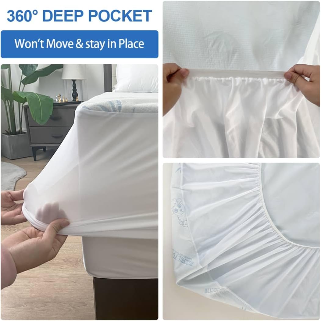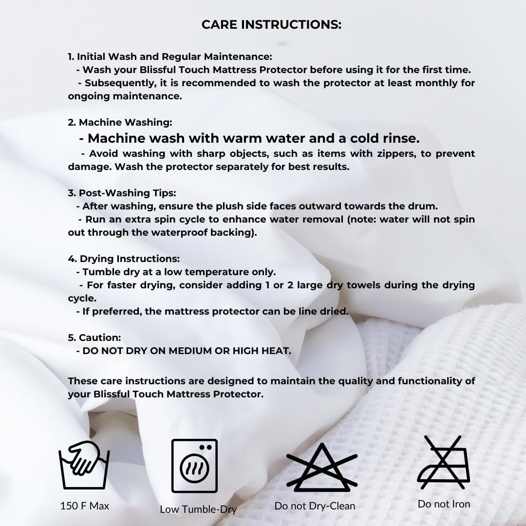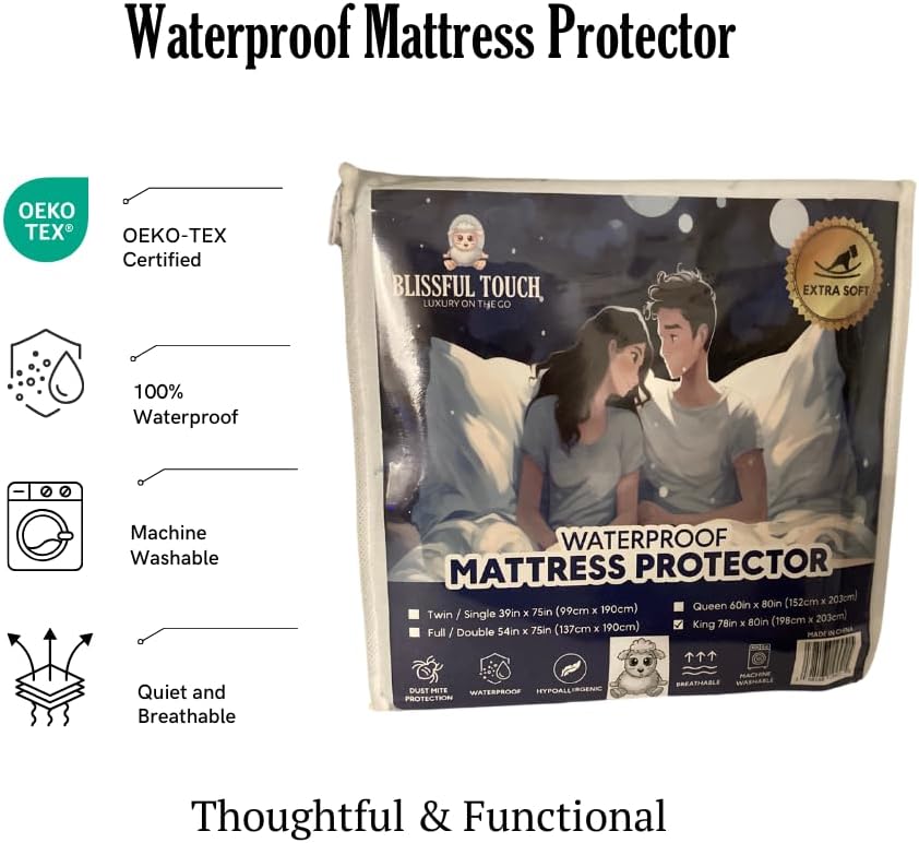 Whether you're looking for a reliable waterproof mattress protector, a breathable mattress cover, or a machine washable mattress cover that keeps up with your lifestyle, the Blissful Touch is the perfect choice. Itâs designed to enhance comfort while ensuring your mattress stays in excellent condition for years to come. Donât compromise on quality â choose a skin-friendly mattress protector that feels as good as it looks.