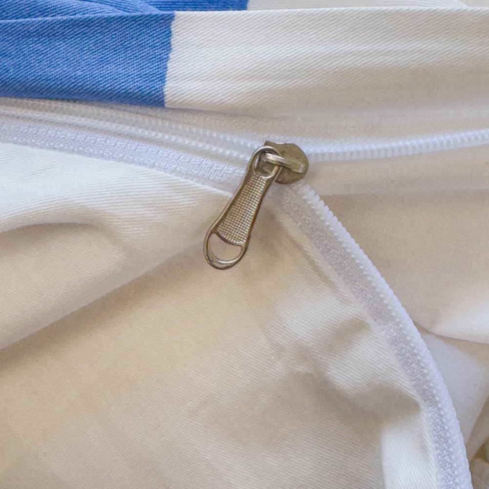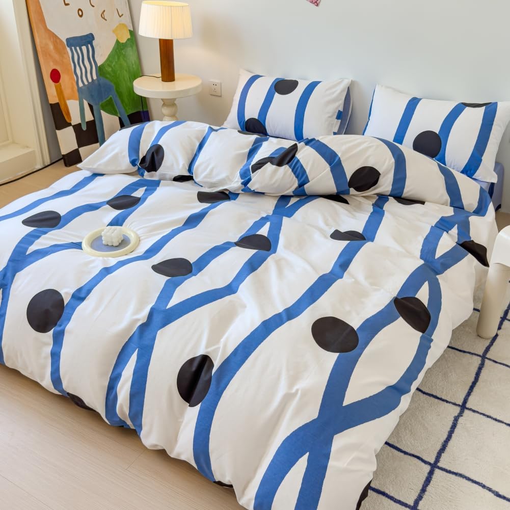 Stylish and soft 100% cotton duvet cover set for kids. Features blue ripple stripes and black dots design. Includes twin size duvet cover and two pillowcases. Hidden zipper and ties for secure fit. Easy to care for and machine washable bedding solution.