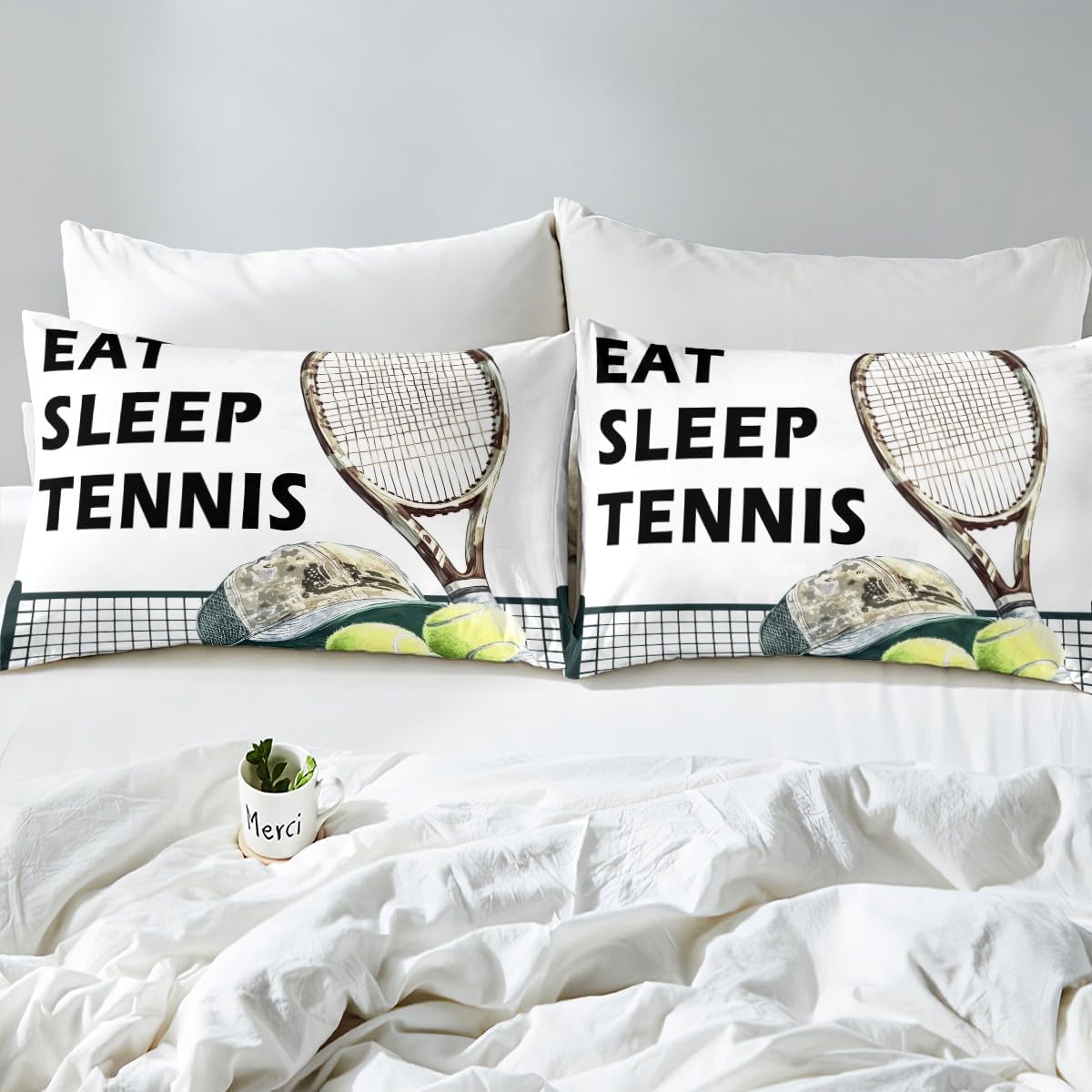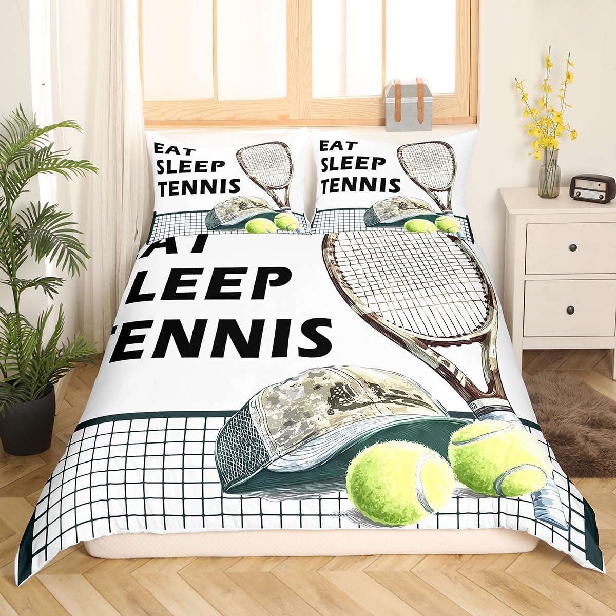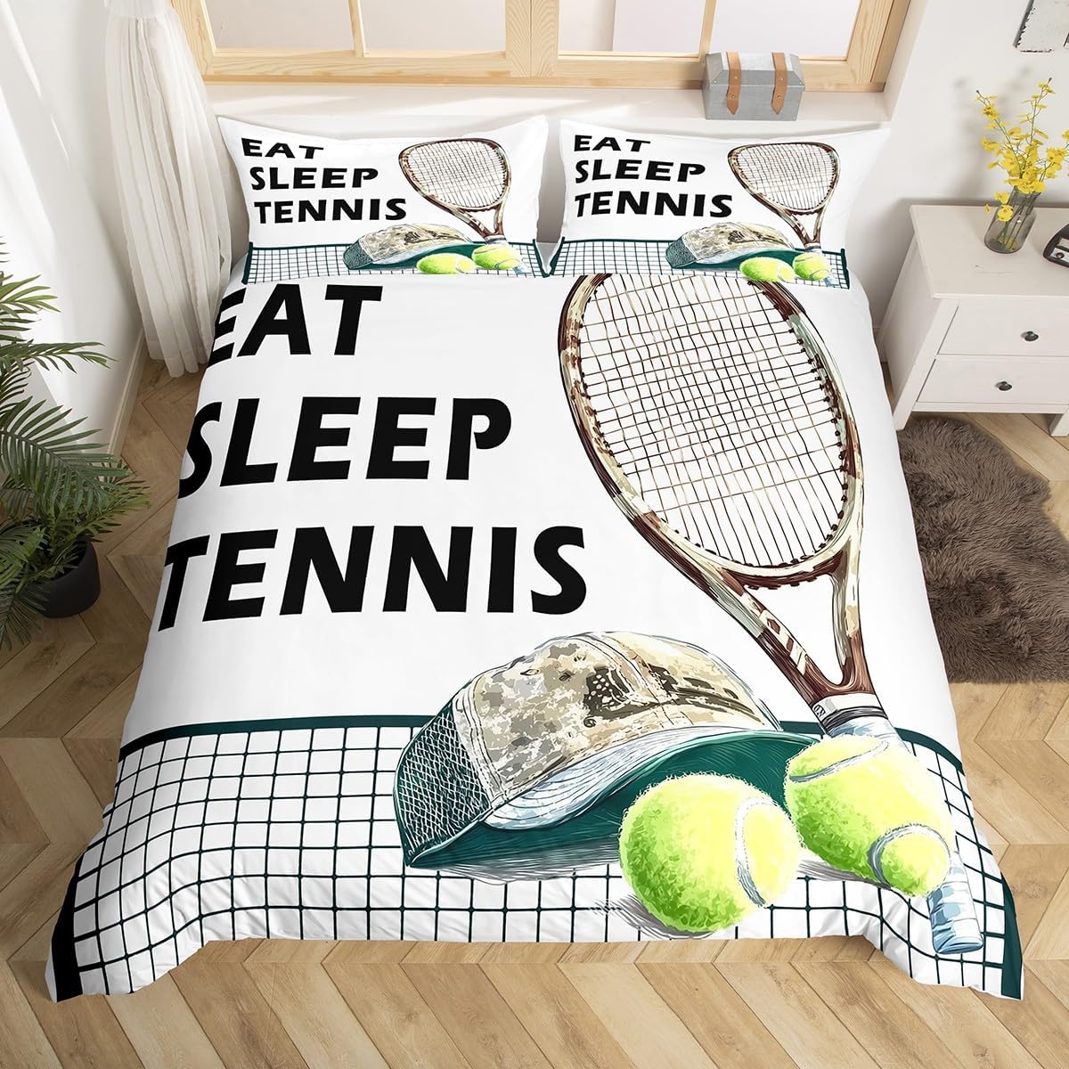 Elevate your bedroom with this stylish and soft tennis duvet cover set in twin size. The watercolor print of tennis rackets and a ball adds a playful and artistic touch, making it a great decorative choice for any space. Crafted from high-quality microfiber polyester, this duvet cover feels as soft as cotton but requires minimal maintenance. Its durable design retains vibrant colors and smooth texture even after repeated washes, ensuring long-term use and satisfaction. Designed with practicality in mind, the built-in zipper closure allows for easy access to the duvet, while the four corner ties keep the comforter securely in place. This modern and versatile piece is perfect for sports enthusiasts or those who want to infuse fun into their decor. Ideal for creating a sports-themed room for your kids or adding a unique flair to your own bedroom, this set offers both comfort and aesthetic appeal. It's great for use in bedrooms, guest rooms, dorms, or even hotel settings where style and functionality are equally important. This Castle Fairy Tennis Duvet Cover Twin Size Set is more than just a fabric coverâit's a statement of personality. Whether you're looking to create a whimsical sports-themed room or simply update your bedroom decor, it adds a fresh and unique vibe that stands out. With its lightweight, easy-care fabric, it's perfect for daily use, making it a great addition to any home. The modern, gothic, or chic design seamlessly adapts to different bedside styles, ensuring a look that complements your personal taste. Add a touch of fun and comfort to your sleeping space with this unique duvet cover set. Its blend of trendiness and durability ensures it's both practical and visually appealing for years to come.Castle Fairy Tennis Duvet Cover Twin Size Set