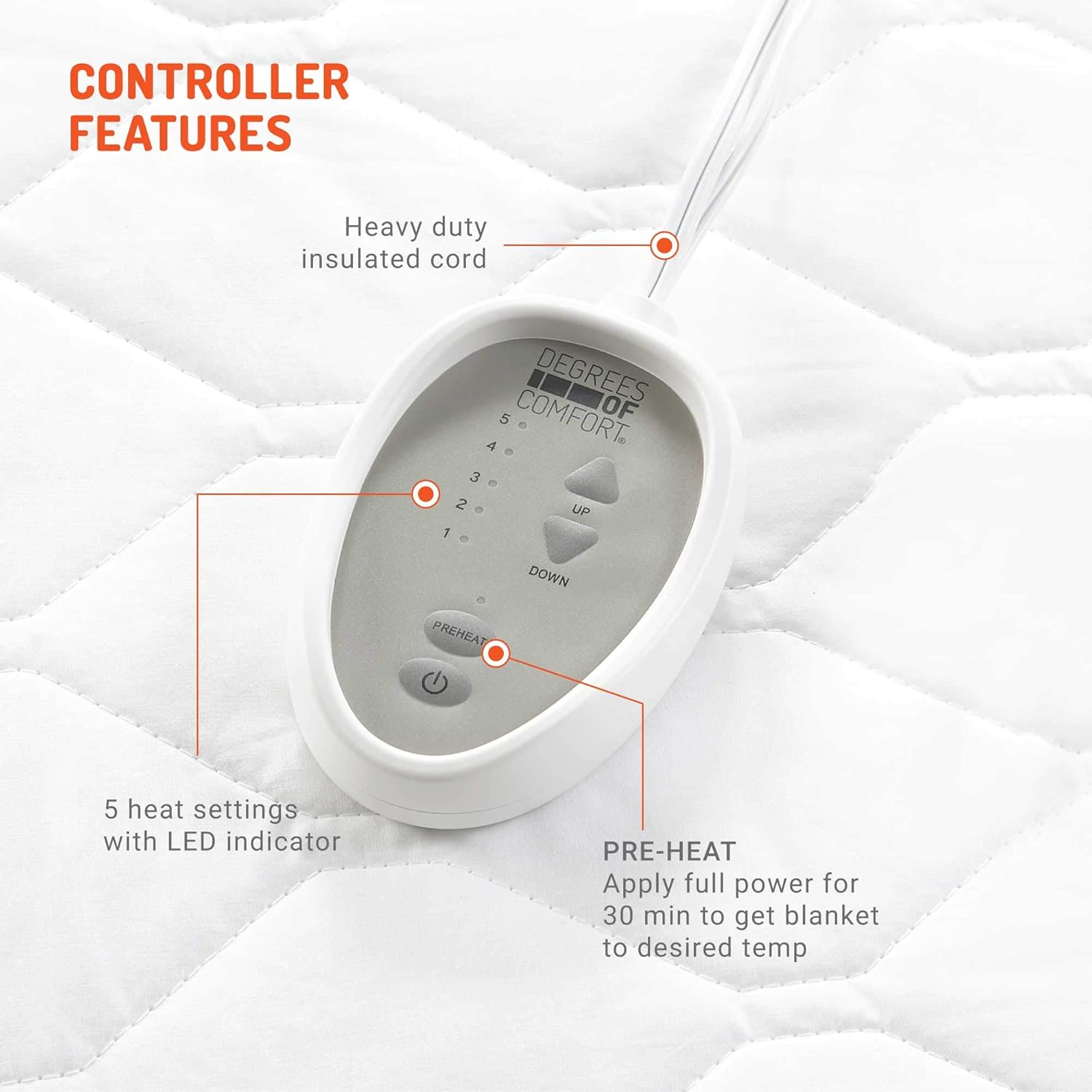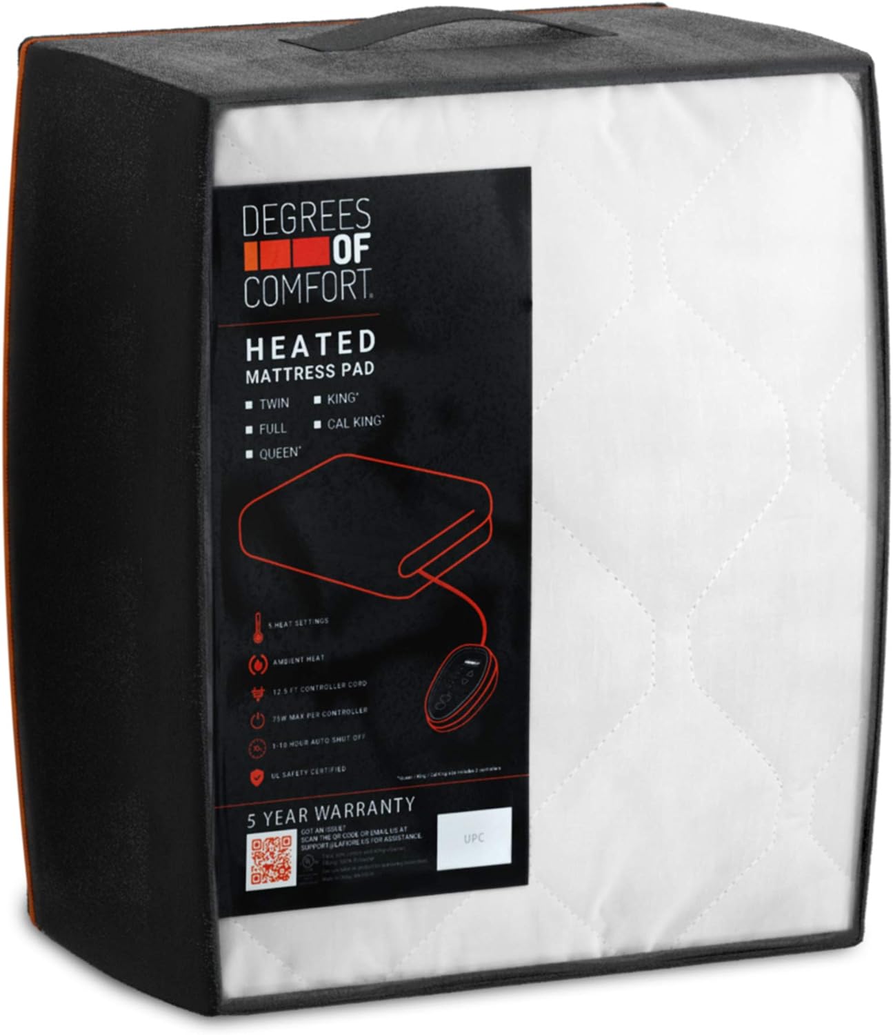 The Degrees Of Comfort Heated Mattress Pad is designed to bring warmth where you need it most, without sacrificing comfort or safety. Its advanced zone heating technology allows you to customize the temperature on your side of the bed while keeping the other side cool, making it an ideal choice for couples with different preferences. Whether you're battling chilly nights or simply want to enhance your sleep experience, this pad provides the perfect solution. With its soft, breathable polyester fabric, the Degrees Of Comfort Heated Mattress Pad ensures a restful night's sleep. The plump inner filling keeps the cord out of your way, so you can focus on comfort. It's also waterproof, protecting your mattress from spills and keeping it clean. Plus, the auto shut off feature gives you peace of mind by turning the pad off automatically if it overheats. Whether you're using it for year-round warmth, to soothe muscle aches, or just to stay cozy in bed, this heated mattress pad is designed to deliver the right heatâjust the way you need it. Whether you're a light sleeper or someone who feels the cold easily, this heated mattress pad offers a safe and effective way to stay comfortable. Its modern design and user-friendly control options make it an excellent addition to any bedroom or sleep setup. Enjoy personalized warmth, easy placement, and a safe sleep environmentâall in one. This heated mattress pad is more than just a remedy for the coldâit's a step toward better rest and improved well-being. Don't let discomfort affect your sleepâget the pad that delivers just the right amount of heat, every night.Experience the Perfect Blend of Comfort and Convenience