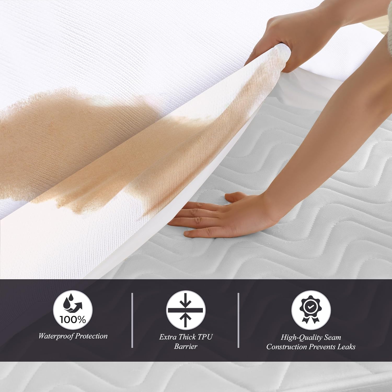 This full-size mattress protector is designed for a safe and healthy sleep environment. Its advanced 100% waterproof TPU layer shields your mattress from unexpected accidents, making it a must-have for households with active children or pets. The soft, breathable design ensures comfort, and the noiseless membrane stops crinkling sounds, guaranteeing a restful night. With a deep pocket construction, it fits 6"-12" thick mattresses snugly, preventing shifting and keeping your mattress safe from wear and tear.