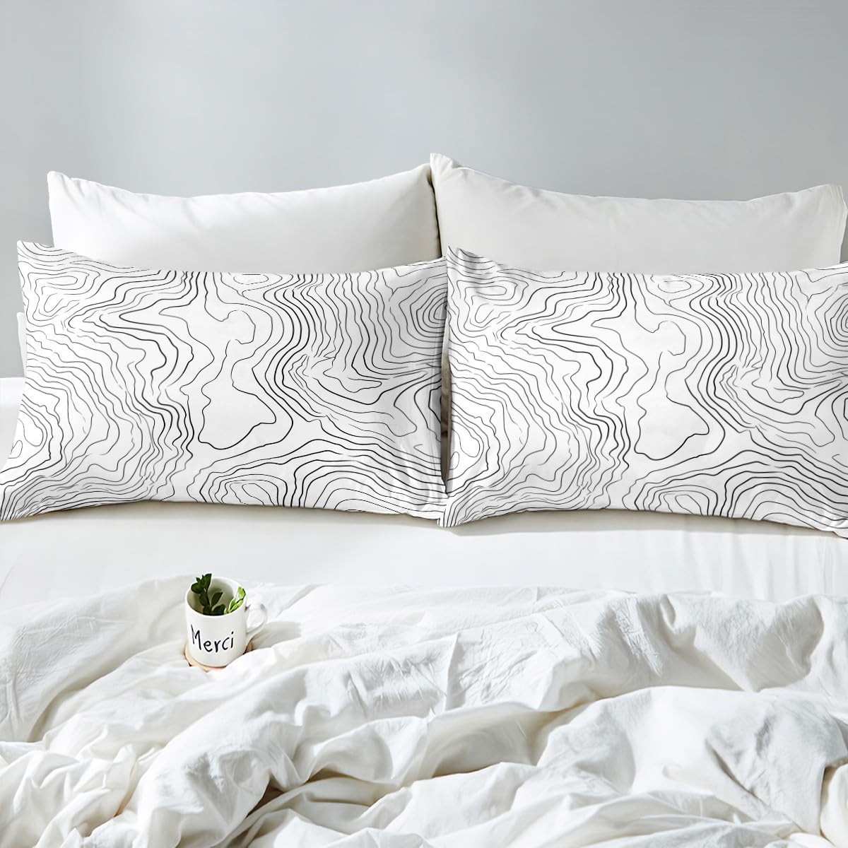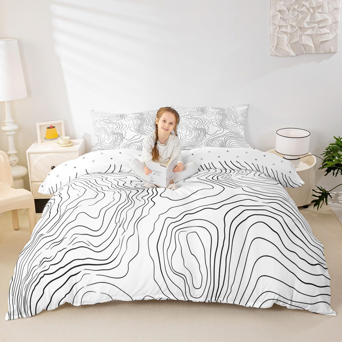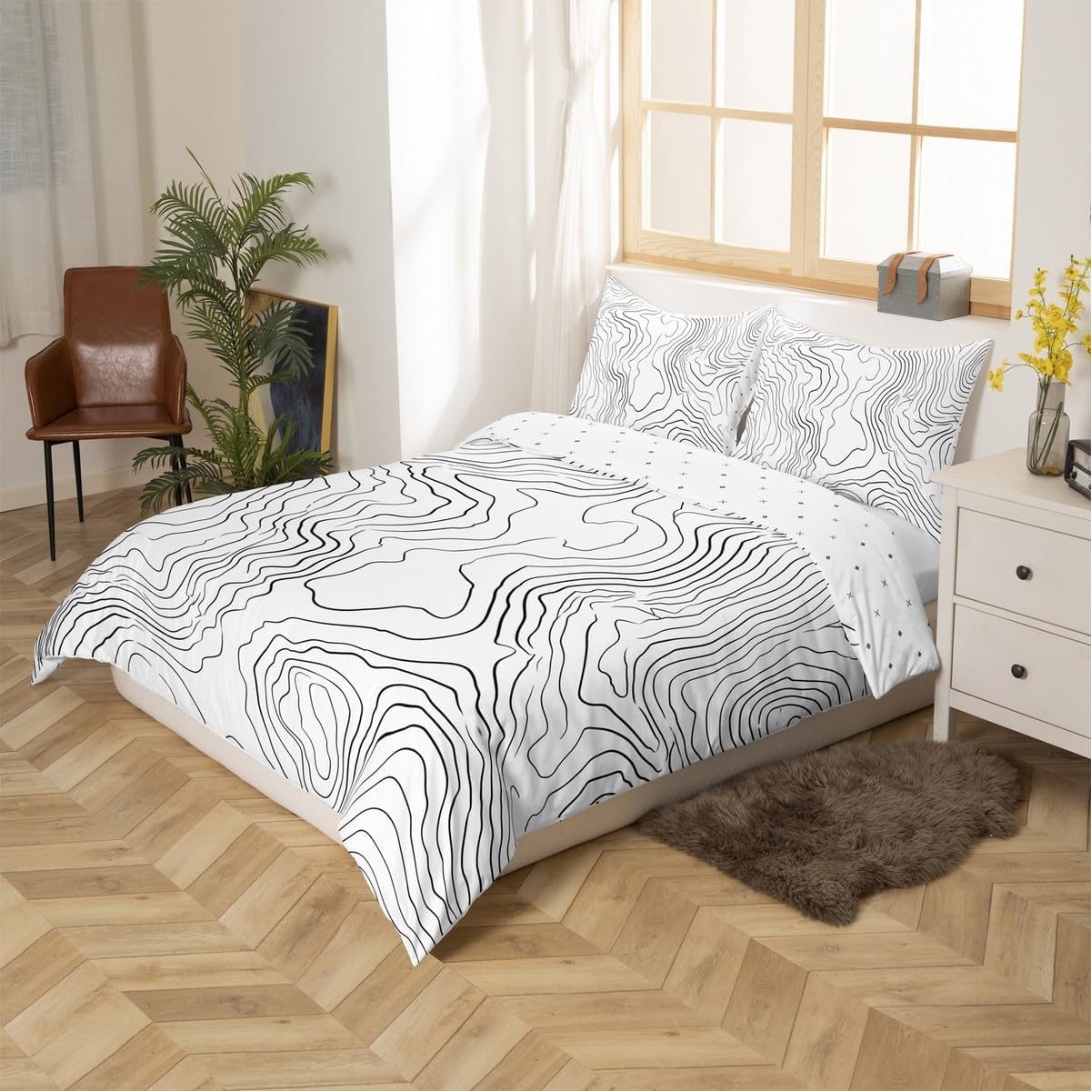 Introducing the Erosebridal king size duvet cover set, where elegant design meets unmatched comfort. This duvet cover features a striking black abstract line print that brings a contemporary and artistic flair to your bedroom. The bold patterns are ideal for modern bedrooms, adding a unique touch that elevates your space. Crafted from high-quality high polyester microfiber, this set ensures a soft, breathable, and durable feel. Itâs perfect for all-season use and maintains its quality through frequent washing. The machine washable and tumble dry low features make it easy to care for, keeping your bedding fresh for years to come. Complete the look with the included 1 duvet cover (104"x90") and 2 coordinating pillow shams (20"x36") that add a cohesive and stylish finish to your decor. The zip-up closure and corner ties make it simple to secure on your comforter, offering a practical and convenient solution. Whether you're decorating your living room, guest room, or bedroom, this Erosebridal bedding set is a great choice. Its geography-inspired theme creates a fun and adventurous atmosphere, while the 3D topographic terrain path design is both imaginative and visually striking. Designed for everyone from kids to adults, this set is a perfect blend of whimsy and luxury that complements any style.Erosebridal King Size Duvet Cover Set