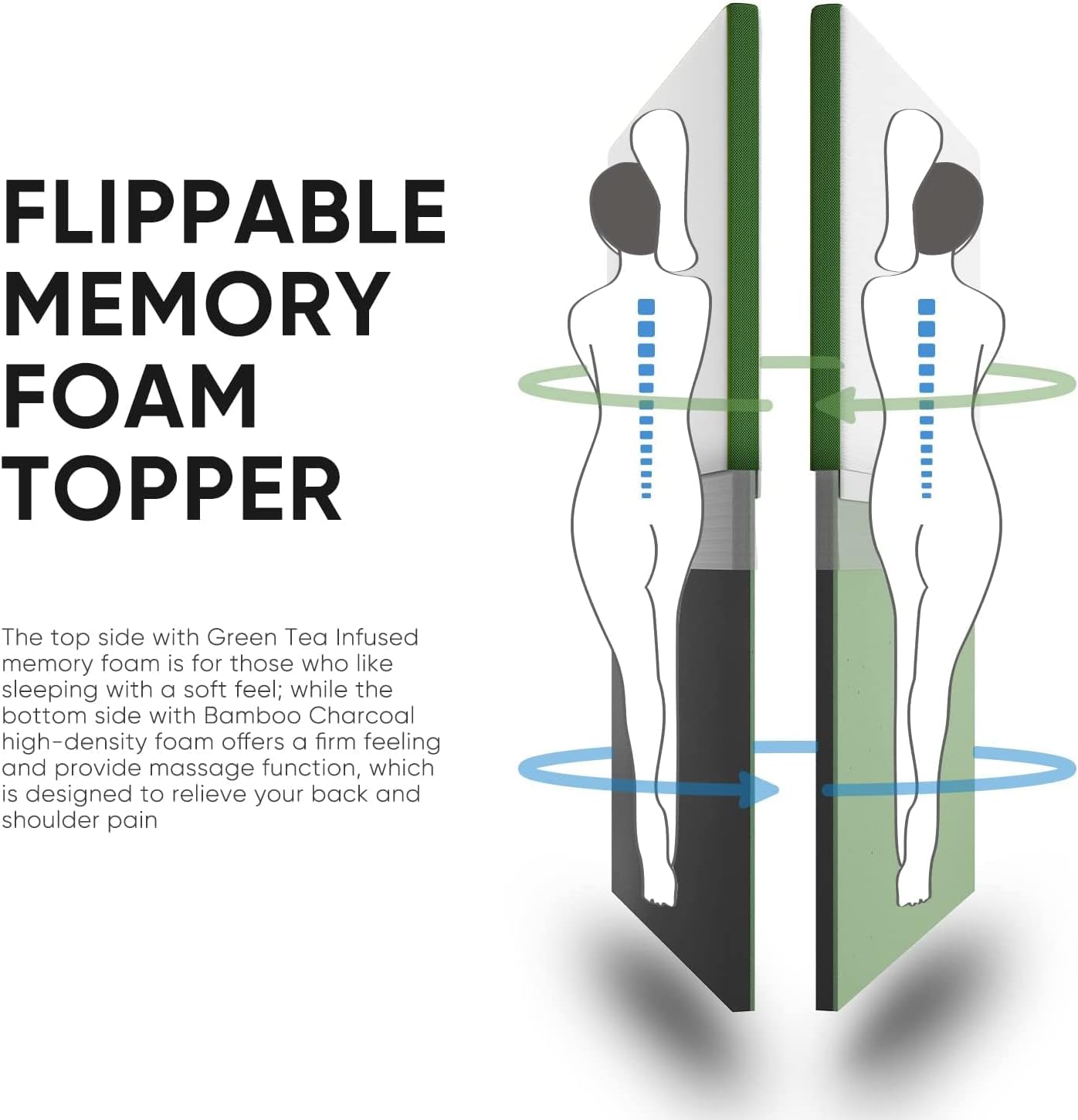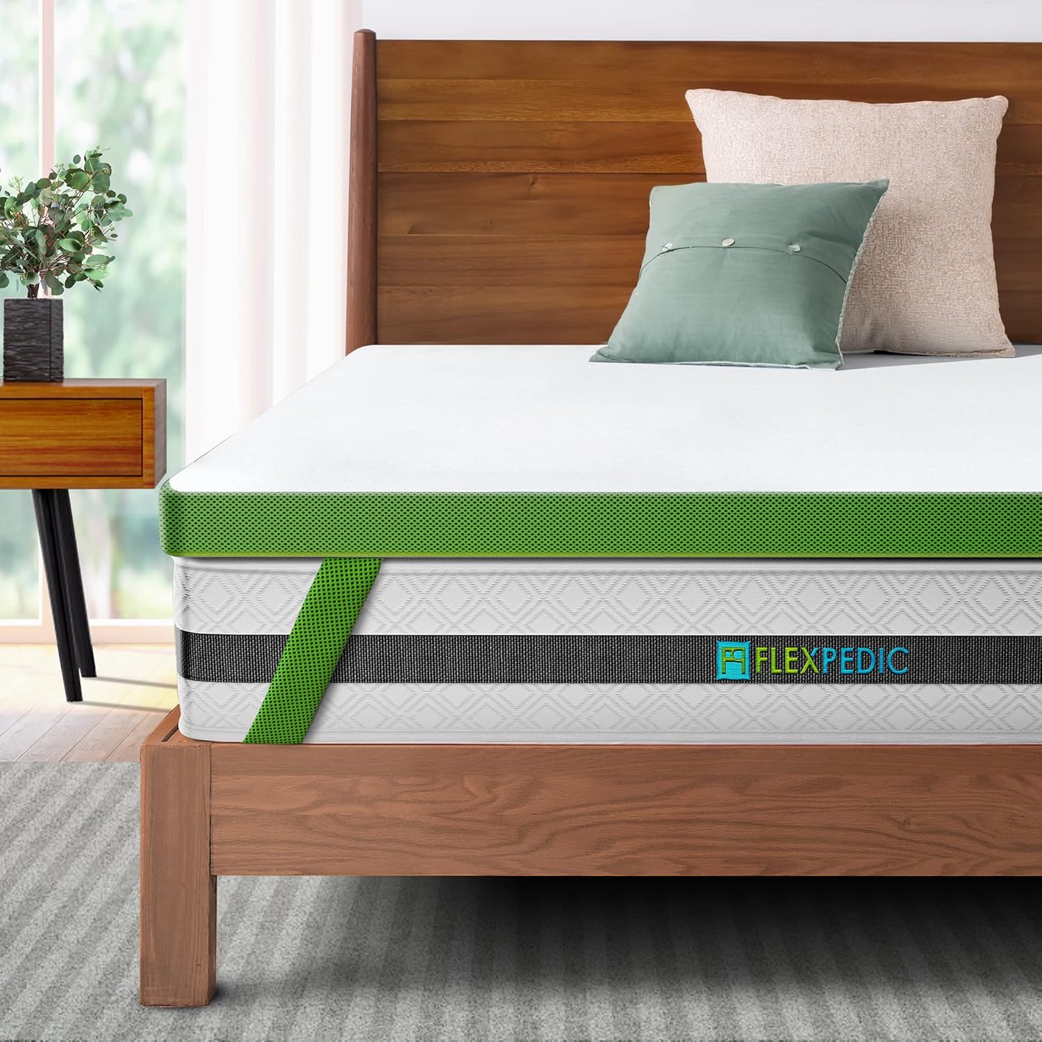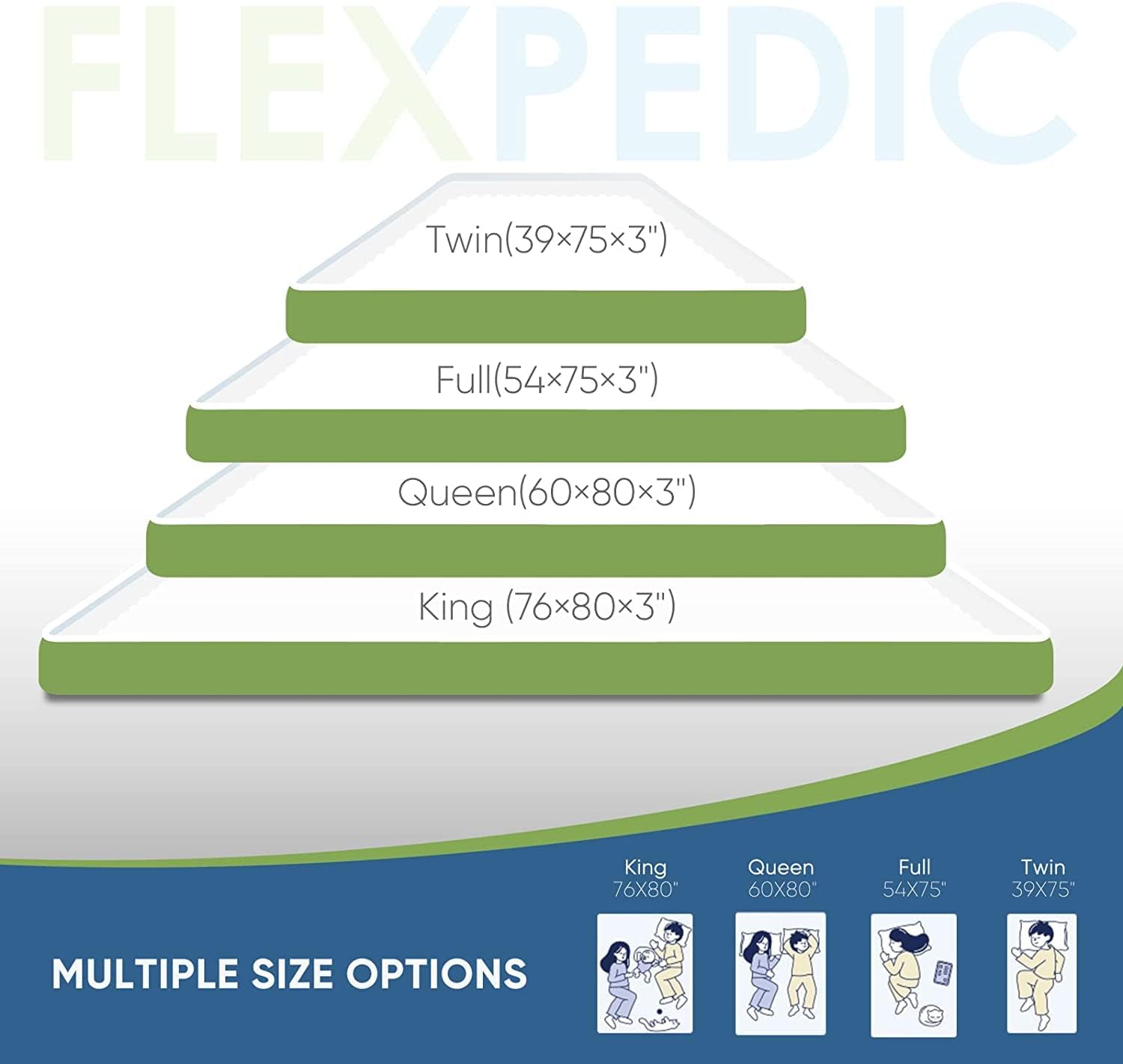 Upgrade your sleep experience with a perfect blend of comfort and support. Designed with dual-sided construction, this topper offers a medium-soft memory foam side for optimal pressure relief and spinal alignment, while the medium-firm high-density foam side provides reliable support for a deep, restful nightâs sleep. Infused with green tea polyphenol and bamboo charcoal, it effectively regulates temperature and manages moisture, keeping your sleep environment fresh and ideal for a healthy, uninterrupted rest. The breathable mesh cover ensures excellent airflow, helping hot sleepers stay cool and comfortable all night long. The FLEXPEDIC 3-inch twin mattress topper is a versatile solution for every lifestyle. Whether you're lounging at home, camping in the wild, or relaxing in your RV, itâs built to adapt. The 3-inch thickness delivers ample cushioning, while the non-slip design and 4 adjustable elastic straps keep it secure on any mattress. Its zippered cover makes cleaning a breeze, ensuring lasting hygiene and performance.FLEXPEDIC 3 Inch Twin Mattress Topper