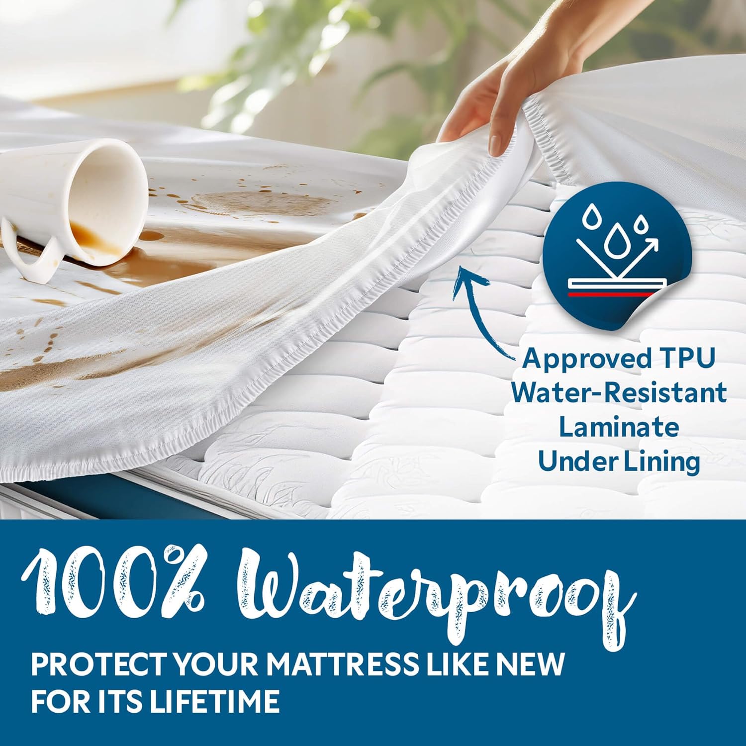 The breathable fabric keeps your mattress cool and fresh, preventing overheating and maintaining a perfect sleeping temperature. Its stretchable skirt extends to 16 inches, ensuring a snug and secure fit around most bed frames. Whether you're using it at home or in a hotel, this protector is built to last and perform.