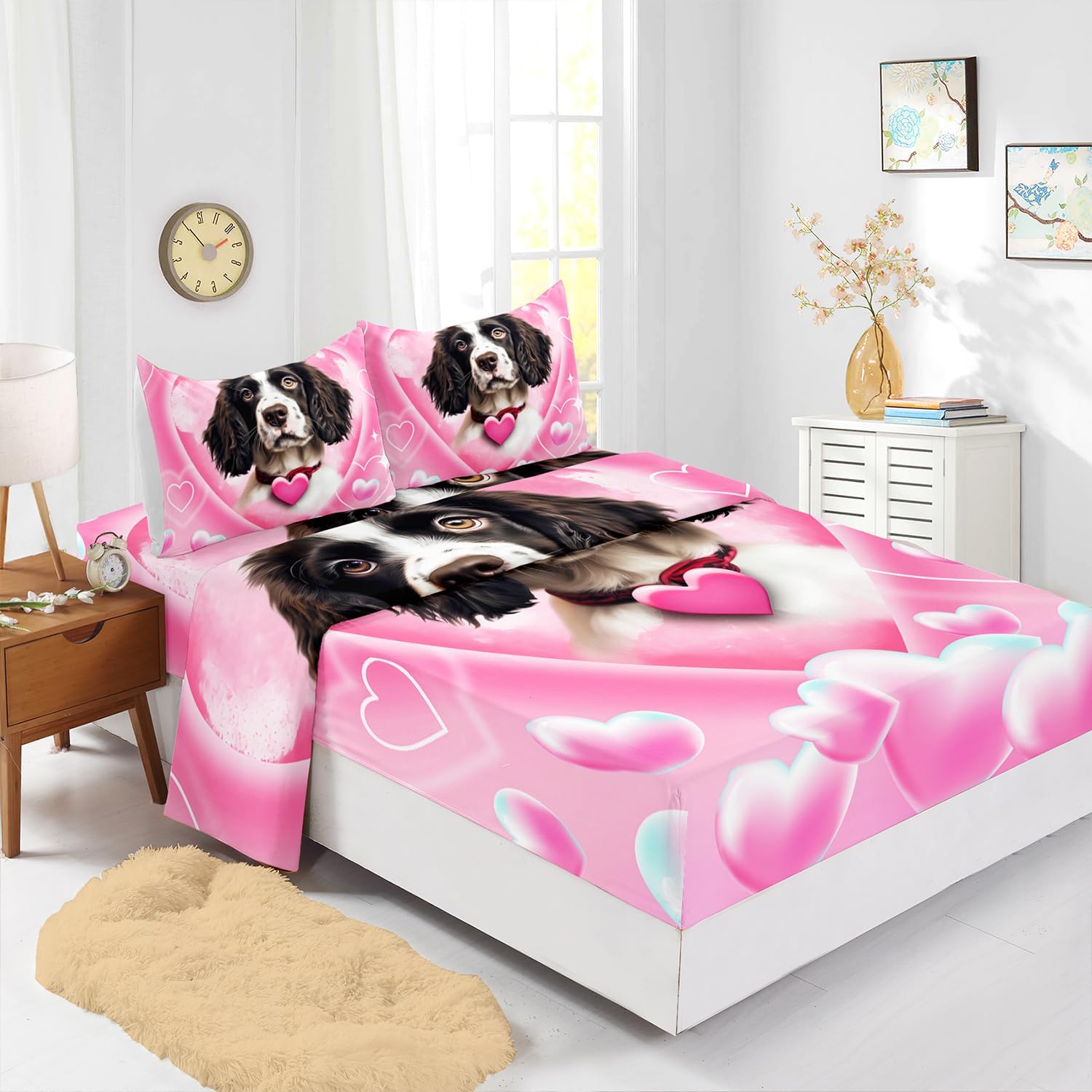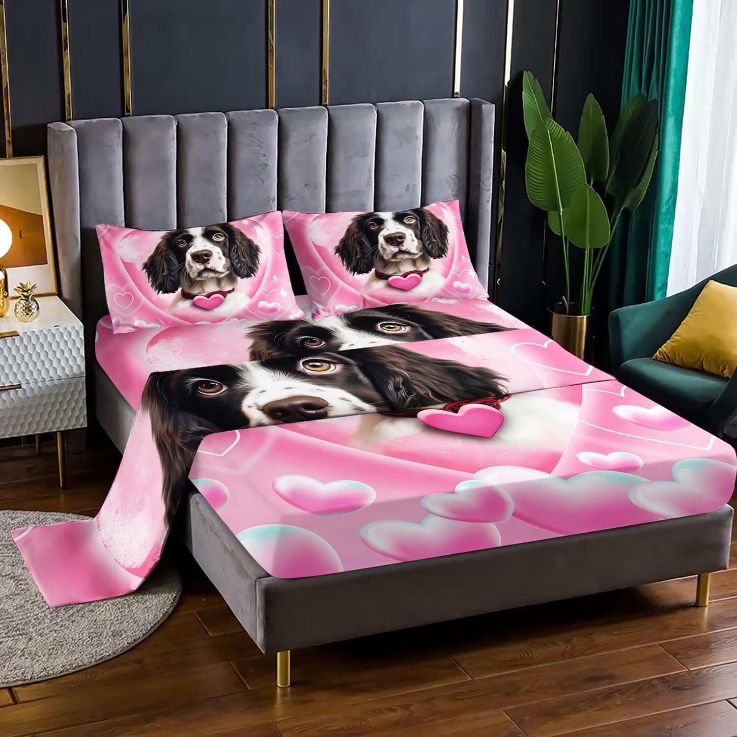 Bring a playful and cheerful vibe to your bedroom or guest room with this Kawaii Cartoon Dog Animal Themed Bedding Set. The unique design features a charming Springer Spaniel surrounded by a large heart-shaped frame, making it an eye-catching addition to any space.