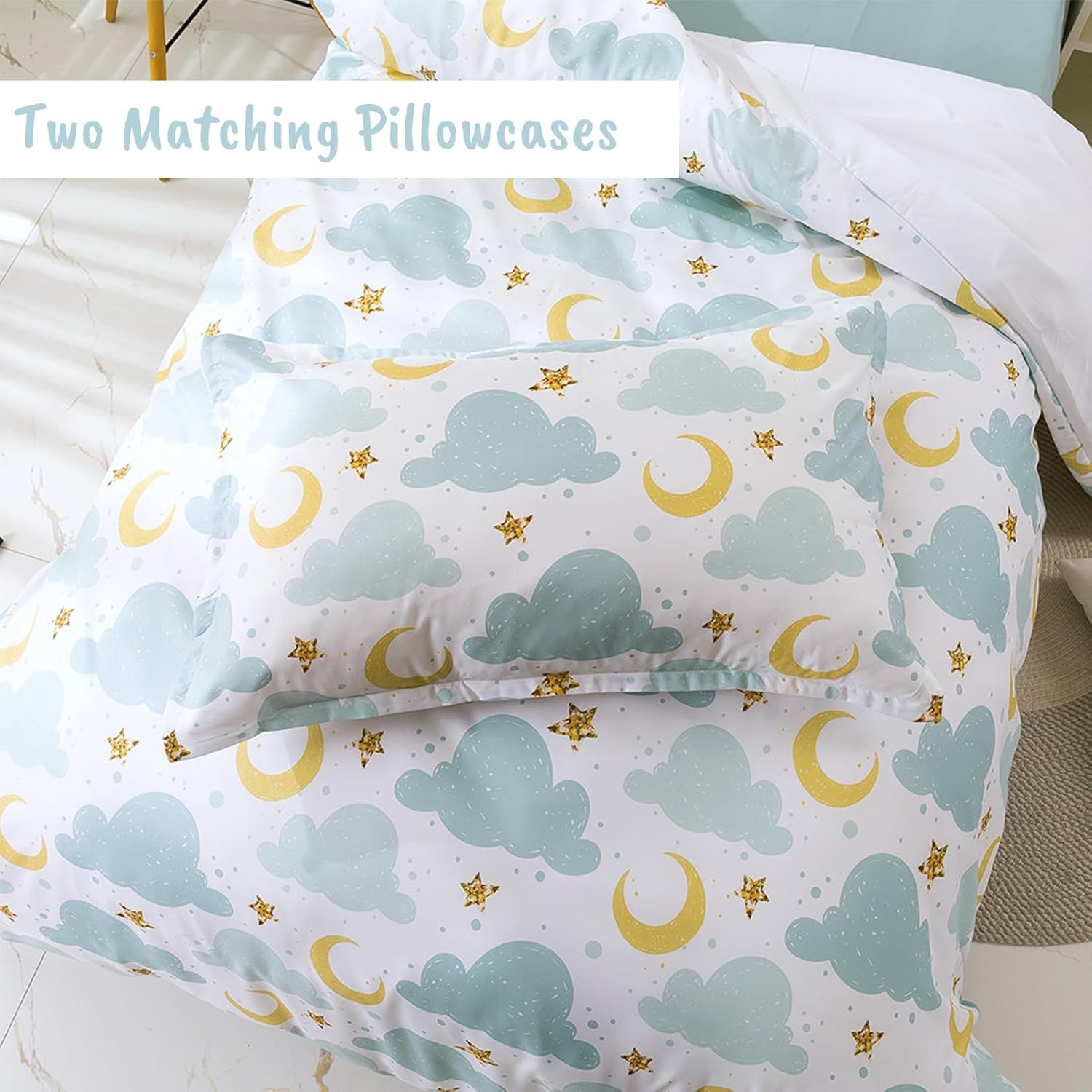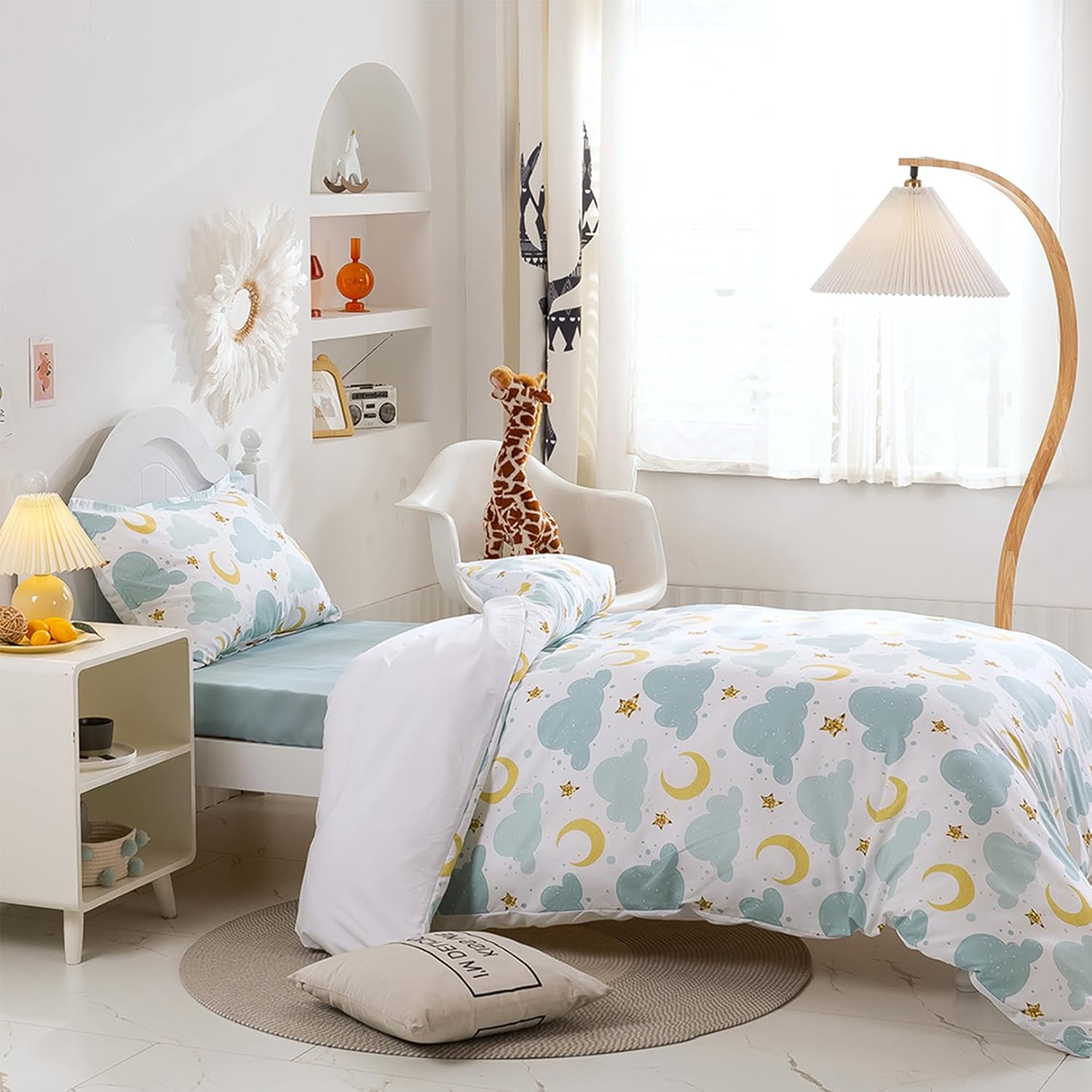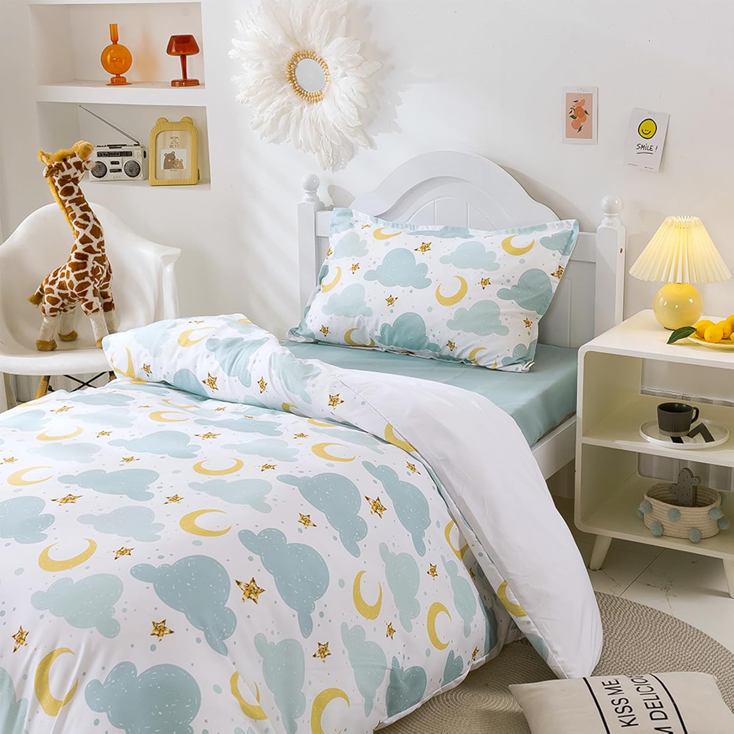 Featuring a vibrant cloud, moon, and stars pattern, this set brings a sense of wonder and calm to bedtime. The design is both playful and soothing, helping kids feel at ease and ready for restful sleep.