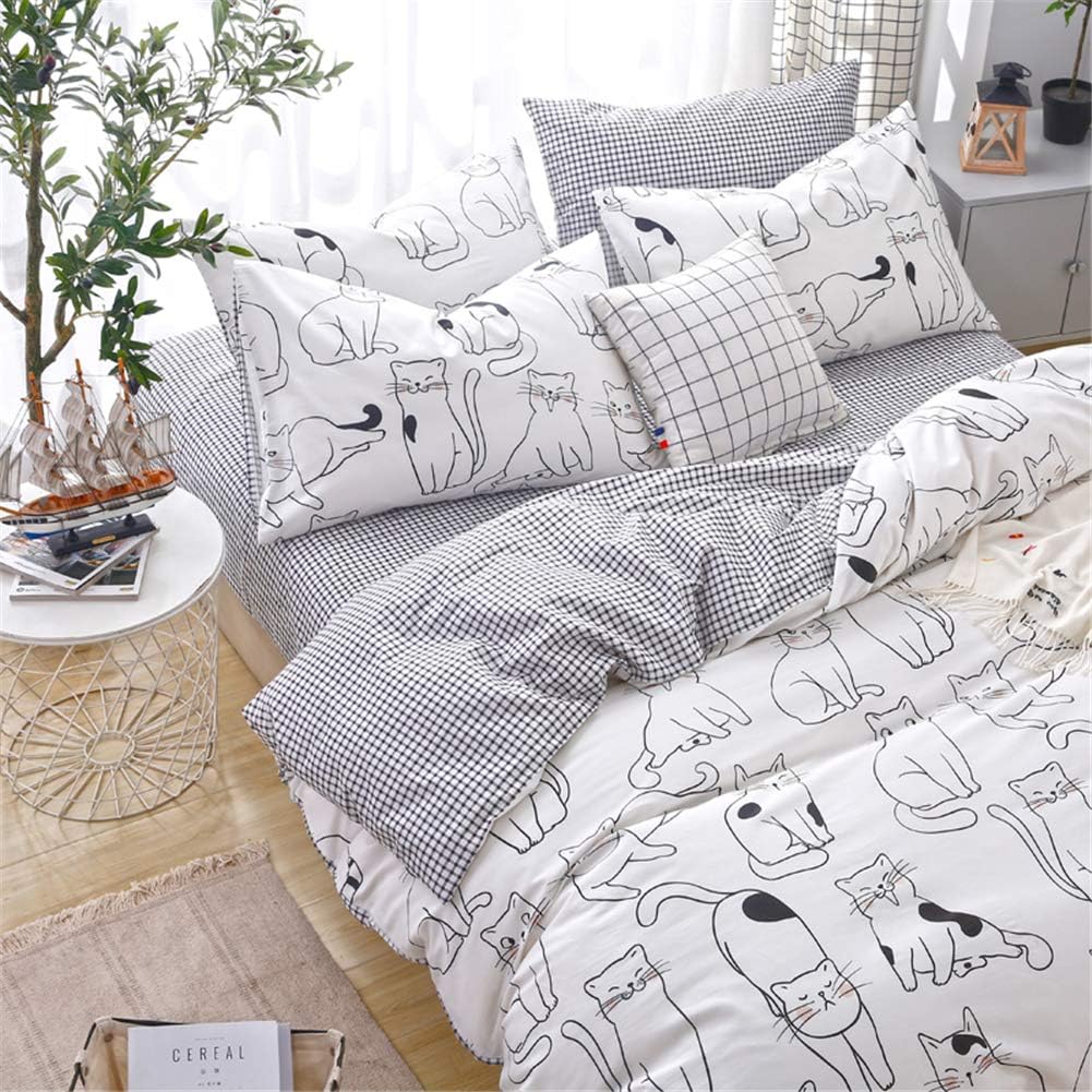 Available in Queen size, this set ensures a snug fit for your bed and features a reversible design. One side offers a classic white plaid look, while the other side showcases a vibrant cartoon cat printâgiving you the freedom to switch up the decor with ease.