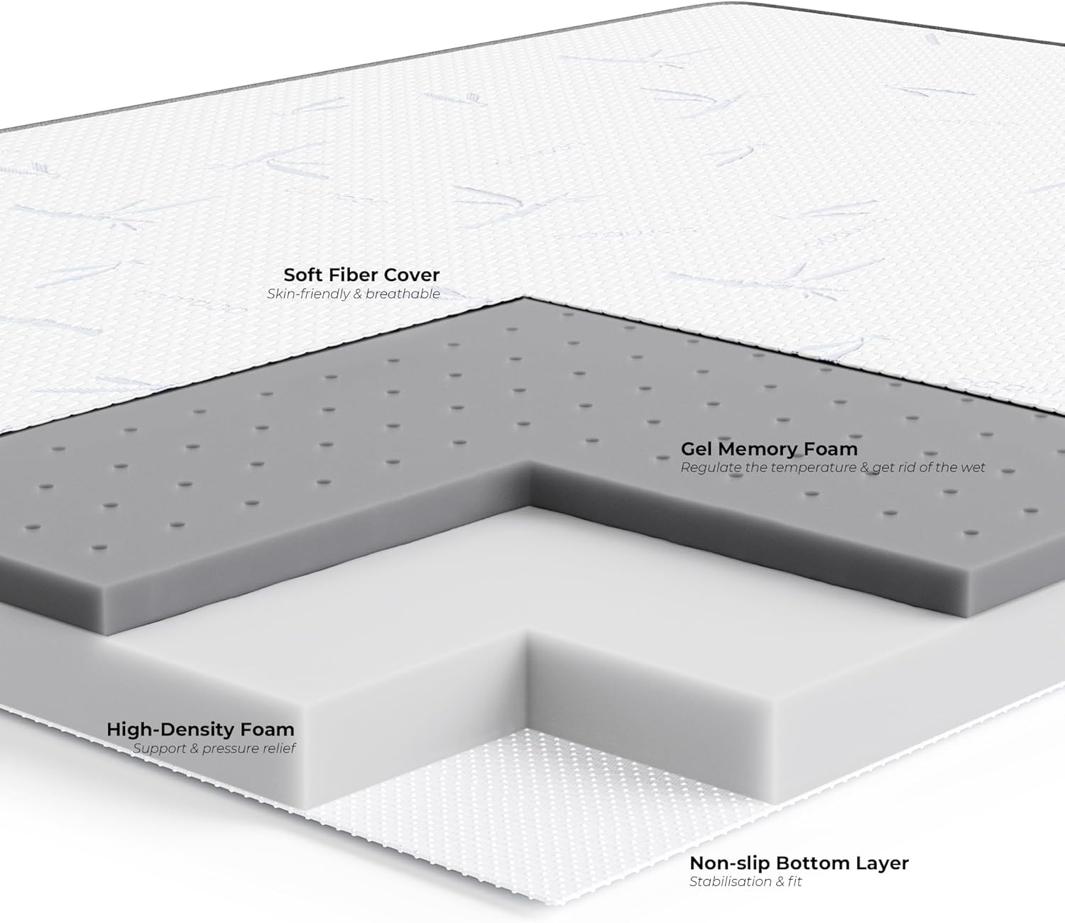 With a breathable, ventilated design and 3D mesh sides, the topper effectively manages heat and moisture, keeping your sleeping surface cool and dry. The non-slip base and corner straps ensure it stays securely in place, eliminating the need for constant readjustment. A machine-washable cover with a convenient zipper makes maintenance quick and easy, so you can keep your topper fresh and hygienic for years to come. Proudly certified by CertiPUR-US and OEKO-TEX, this mattress topper is made with safe, high-quality materials that prioritize your health and comfort.