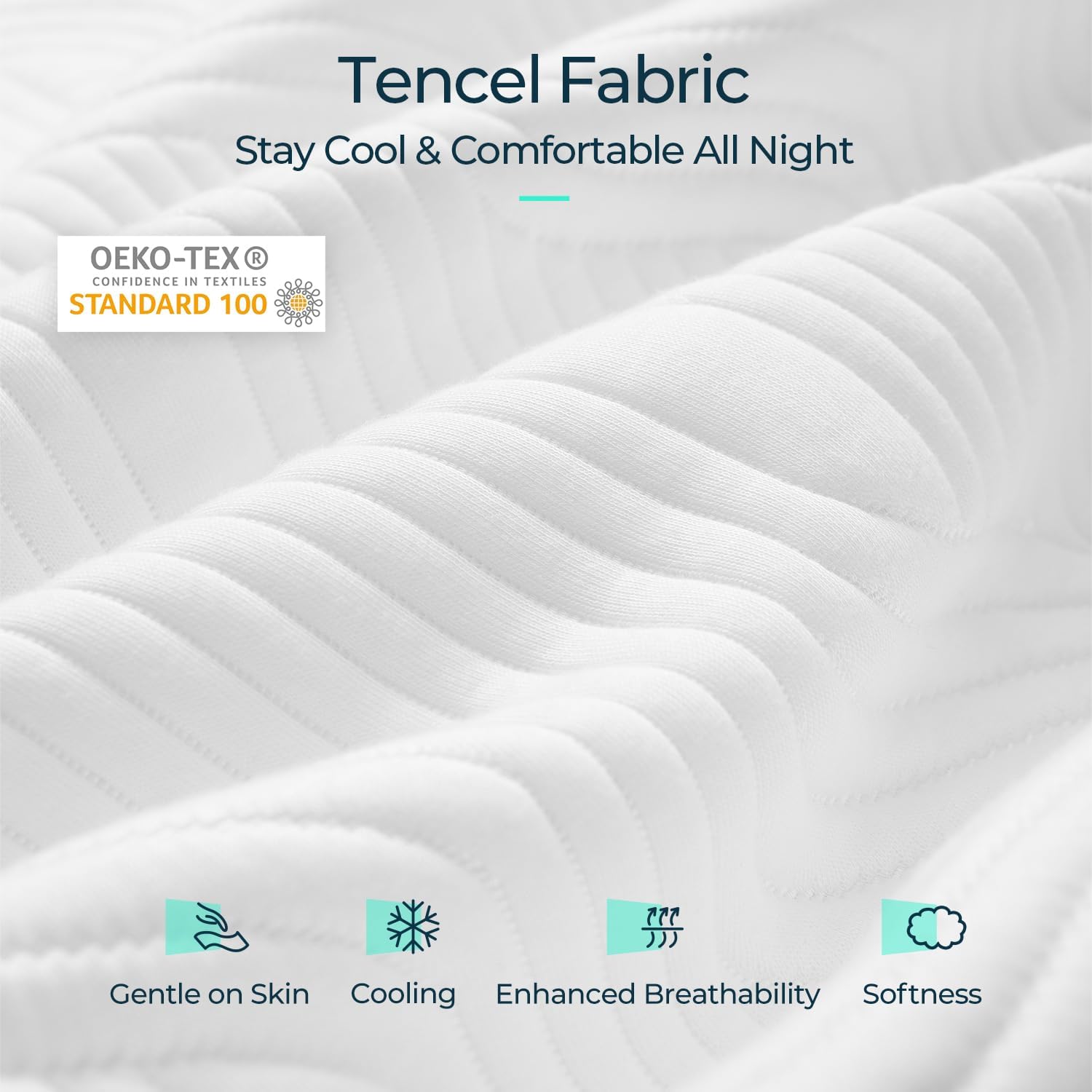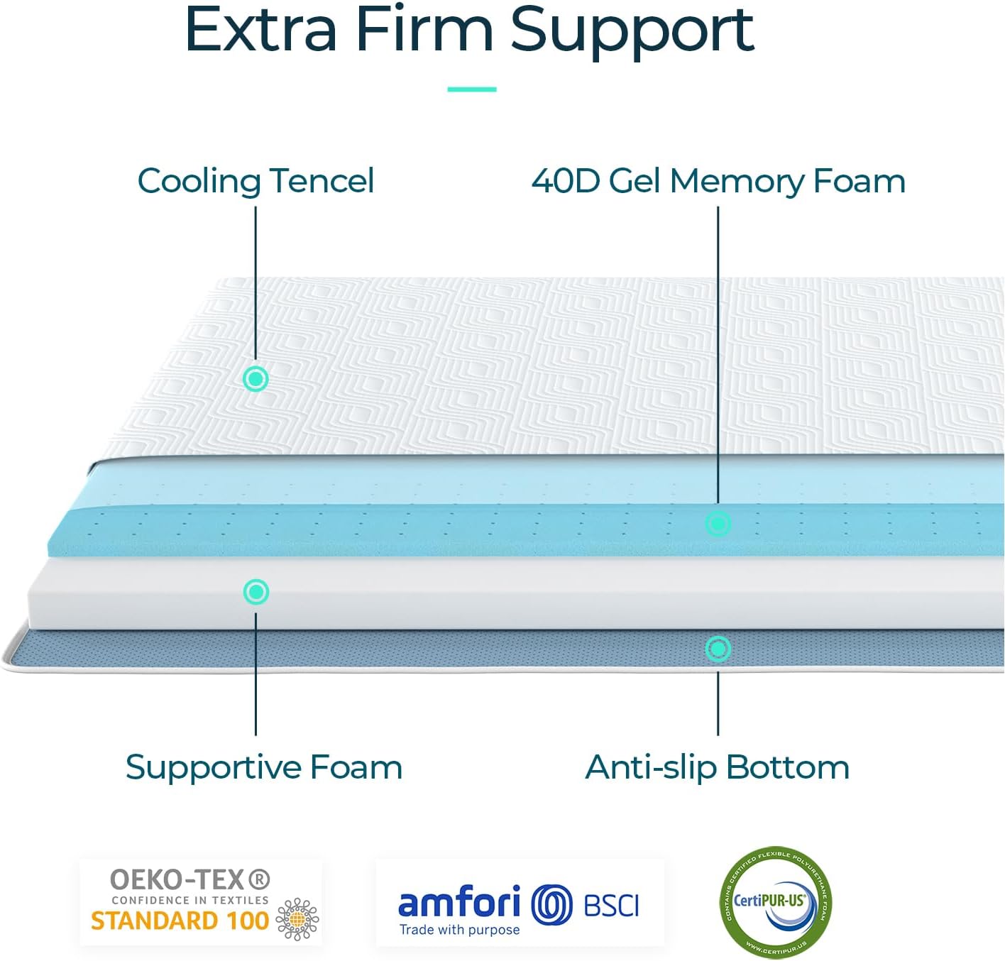 Upgrade your sleep comfort with this premium mattress topper designed to deliver firm support and a cool, restful night. The advanced cooling gel infused memory foam helps regulate temperature, keeping you cool even on the hottest nights. Paired with a soft, breathable Tencel cover, it feels smooth and comfortable against your skin, ensuring a better night's rest for everyone.