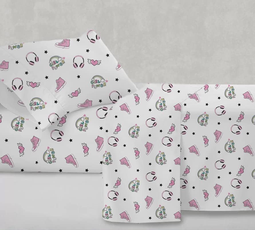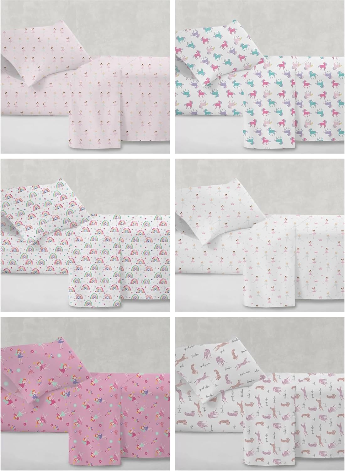 LITTLE CELEBRITY offers a 3-piece twin sheet set with a flat sheet, fitted sheet, and standard pillowcase. Made of soft polyester microfiber, these durable and washable sheets come with all-sided elastic and fun designs, ideal for kids' bedrooms or travel accommodations.