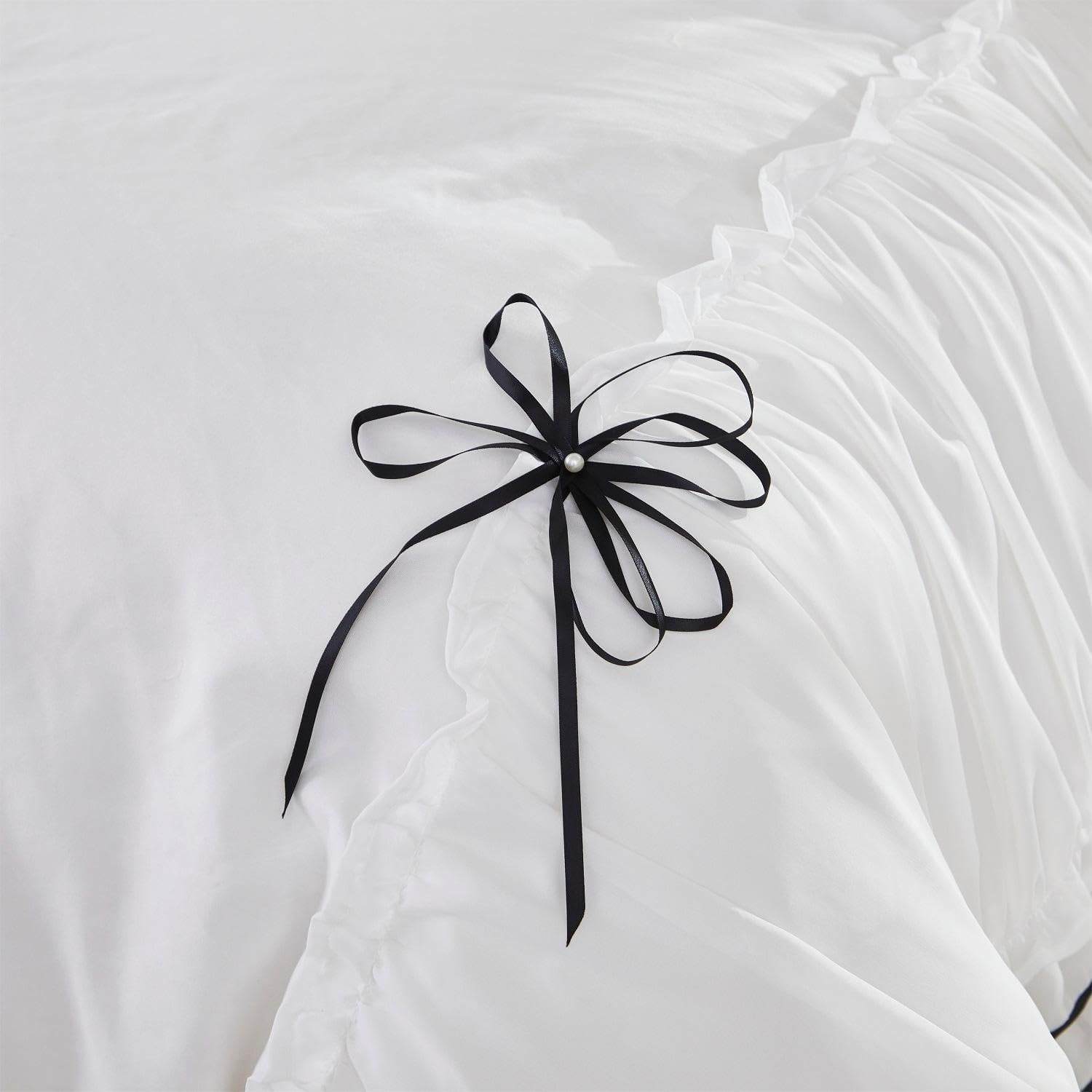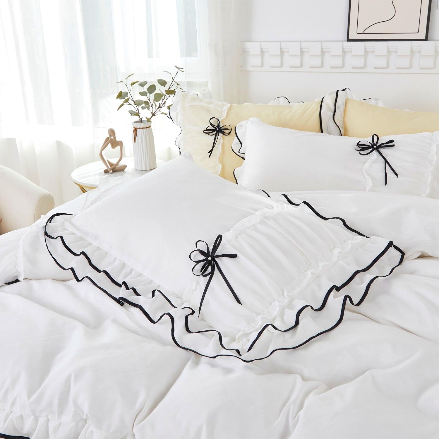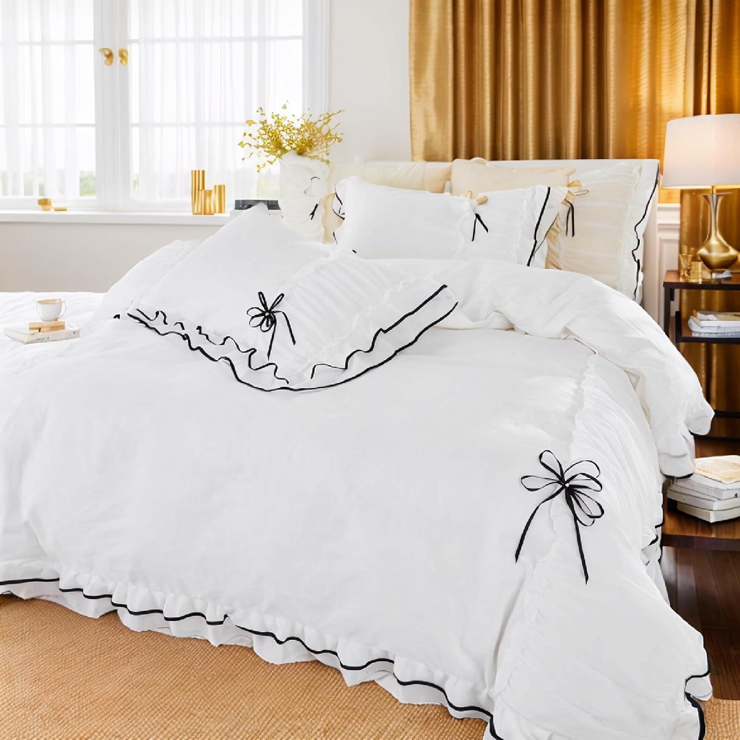 This Lemfux Duvet Cover Set is designed to add a touch of elegance and softness to your bedroom. Featuring a ruffled white design with a delicate lace bowtie, it brings a whimsical, romantic charm that's perfect for a girl's room or any cozy sleeping space. The high-quality microfiber fabric ensures comfort and breathability, offering a smooth feel and long-lasting durability. Whether it's a special occasion or just a desire for a fresh look, this set creates a serene, sophisticated ambiance for your space.