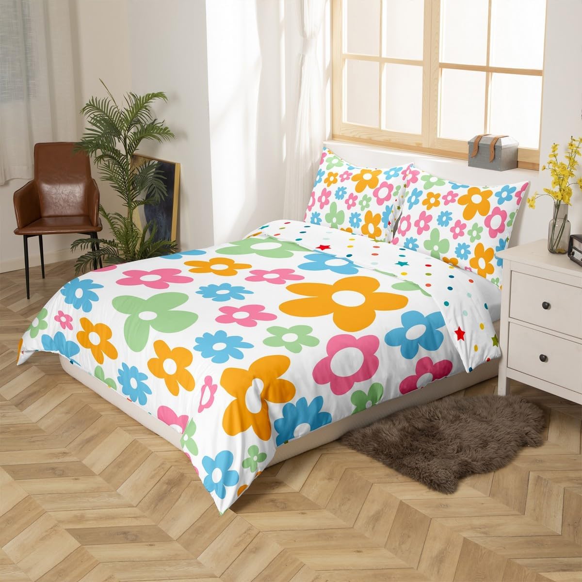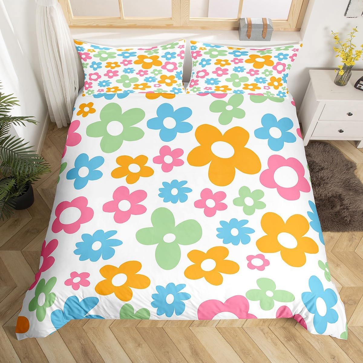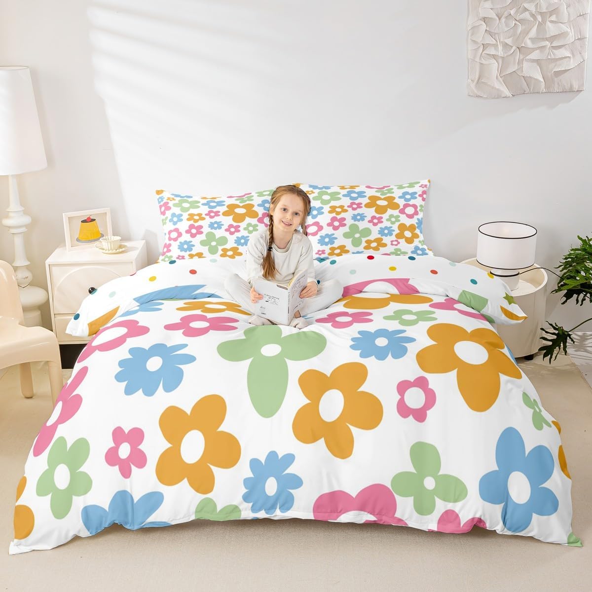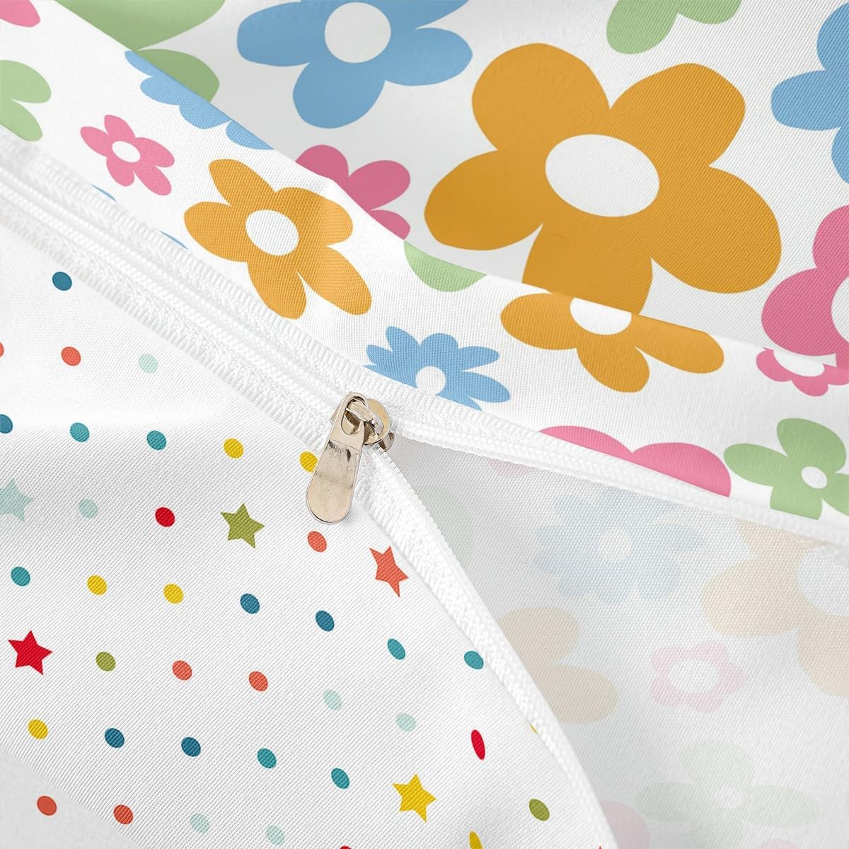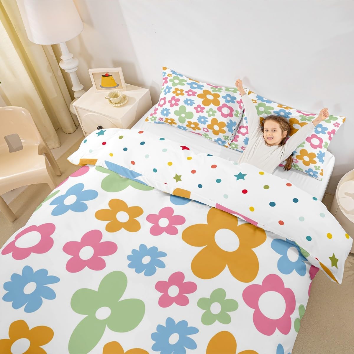 This adorable duvet cover set is designed for toddlers, bringing a playful and stylish vibe to their bedroom. With its vibrant geometric and cartoon floral designs, it adds a cheerful splash of color and charm to your child's space, transforming it into a cozy and imaginative retreat. Crafted from soft and durable microfiber fabric, this set ensures a comfortable and long-lasting experience for your little one. The seamless zipper closure and corner ties make it easy to adjust and secure the duvet, offering convenience without compromising on quality. This eco-friendly bedding solution is also fade-resistant, maintaining its bright colors over time. Whether you're decorating a nursery or upgrading a toddler's room, this set is a perfect blend of style and practicality. It fits seamlessly into modern, vintage, or chic decor styles, making it a versatile and thoughtful addition to any child's bedroom. Whether you're looking for a birthday gift or simply want to add a fresh look to your child's room, this duvet cover set offers both style and substance. It's not just a bedding itemâit's a way to create a warm, inviting, and personalized space for your toddler to sleep, play, and dream.Manfei Kawaii Daisy Duvet Cover Set