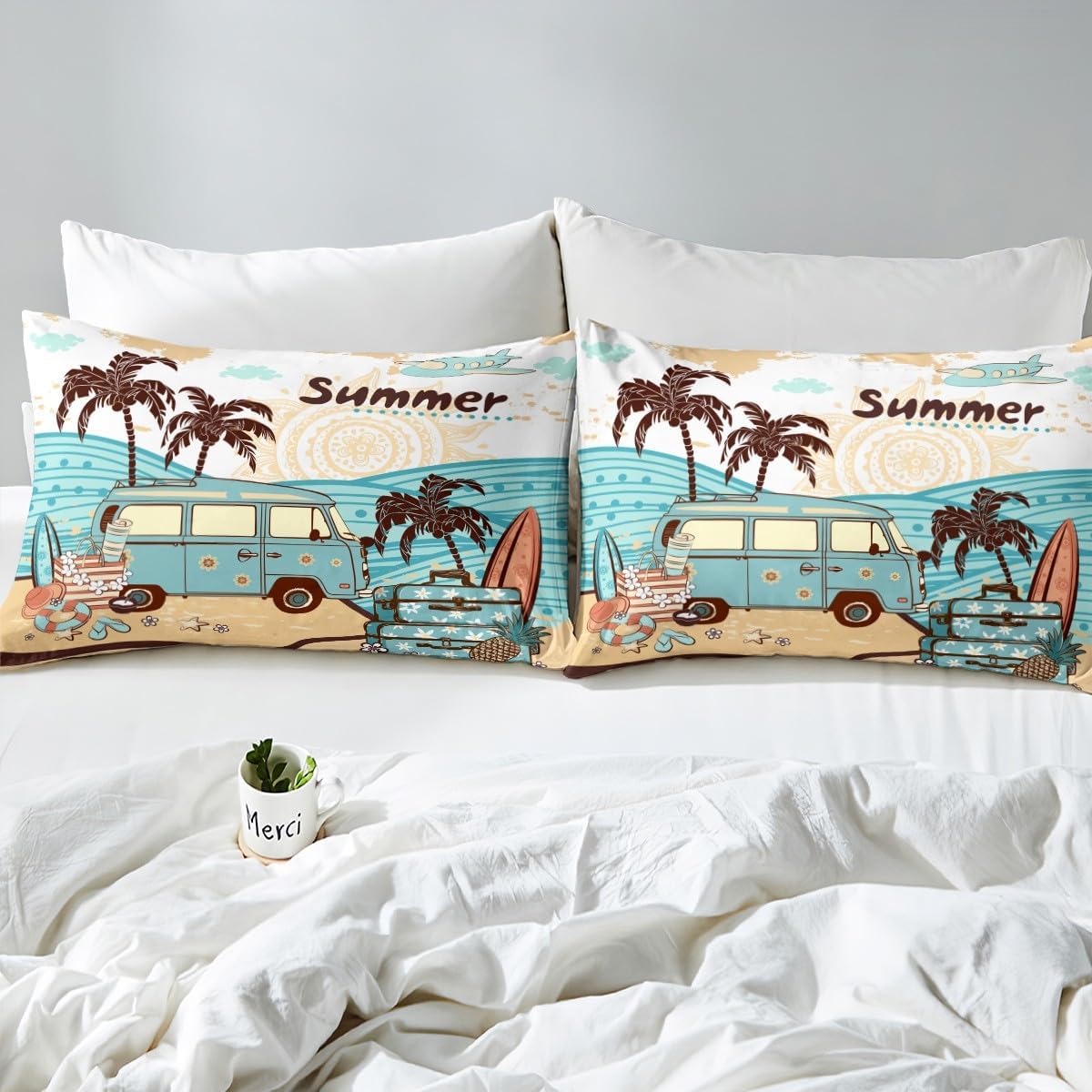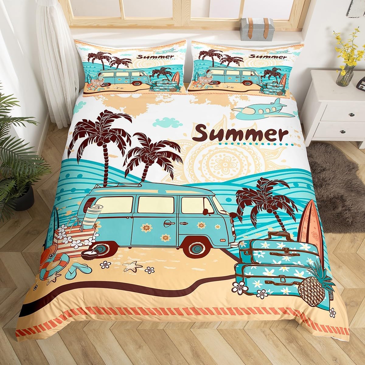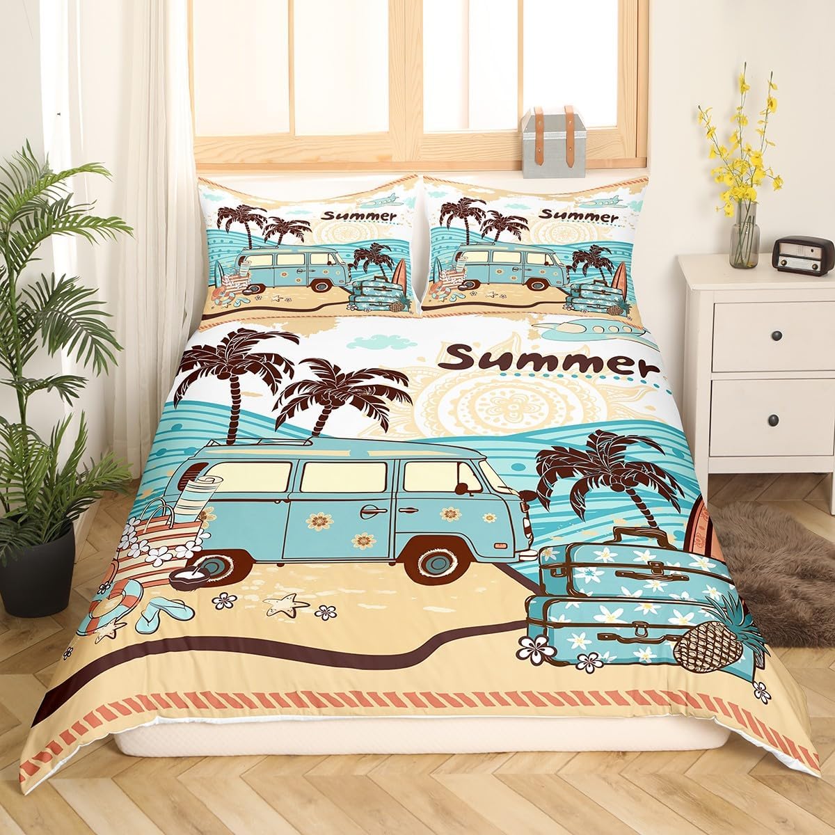 Bring the sunny vibes of Hawaii right into your bedroom with this vibrant and stylish duvet cover set. The tropical designs featuring starfish and coconut trees offer a peaceful and playful atmosphere that suits both kids and adults. Crafted from premium microfiber fabric, this set feels incredibly soft and smooth, delivering a luxurious experience even after multiple washes. The durable, eco-friendly dyeing process ensures that the colors last longer, maintaining their brilliance and freshness. With a convenient zipper closure and corner ties, maintaining your comforter has never been easier or more secure. This set includes a king size duvet cover 104" x 90" and two matching pillowcases 20" x 36", perfect for adding a complete and cozy look to any room. Designed to blend retro and modern elements, it's an ideal choice for those looking to enhance their bedroom decor with a tropical flair. Whether you're decorating a child's room, a guest bedroom, or your own space, this duvet set is sure to make a statement. Add a unique and refreshing touch to your interior with the Manfei Summer Hawaii Duvet Cover Set. A perfect combination of style, comfort, and durability for everyday use.Manfei Summer Hawaii Duvet Cover Set