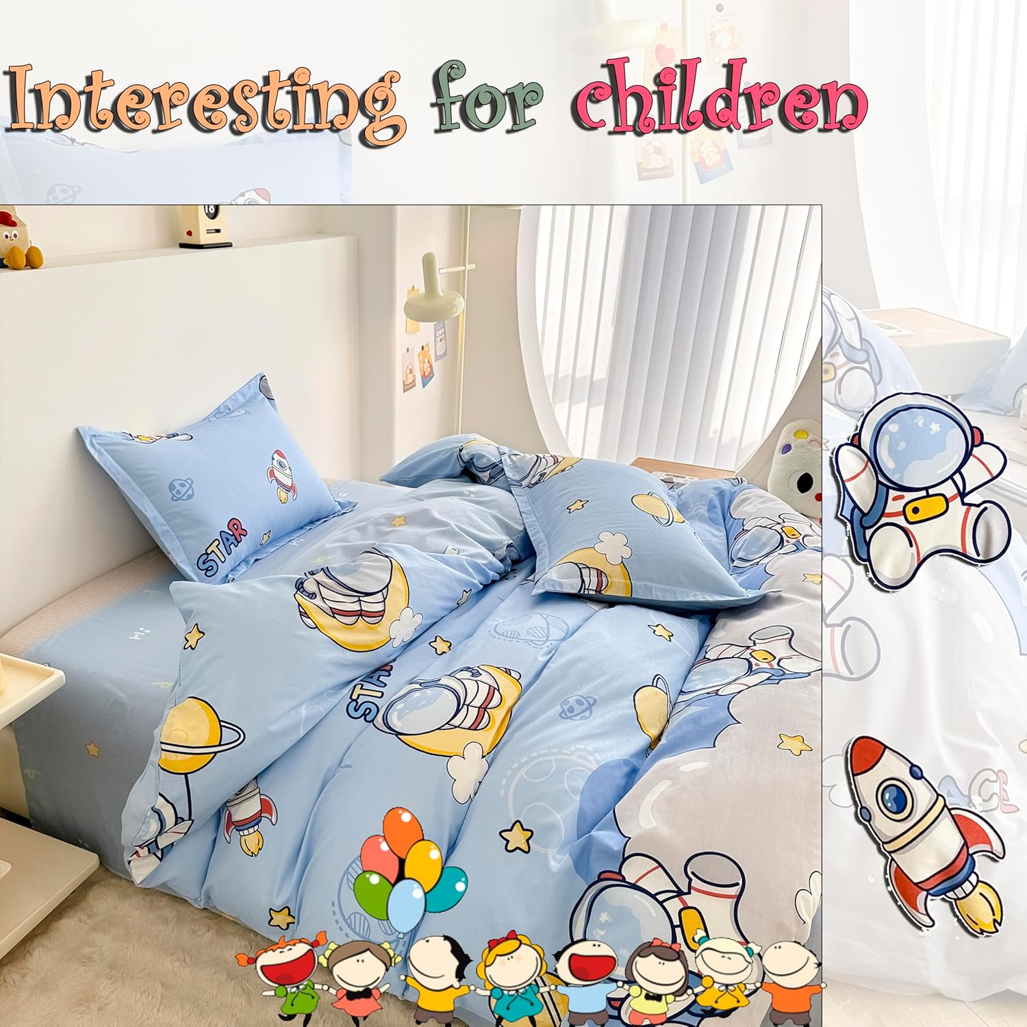 MorroMorn 3-piece bedding set includes 1 queen size duvet cover and 2 pillowcases. Made of 100% cotton, it's soft, breathable, and safe for kids. Features cute cartoon prints and hidden zipper for secure fit. Ideal for bedrooms, nurseries, and dorms.