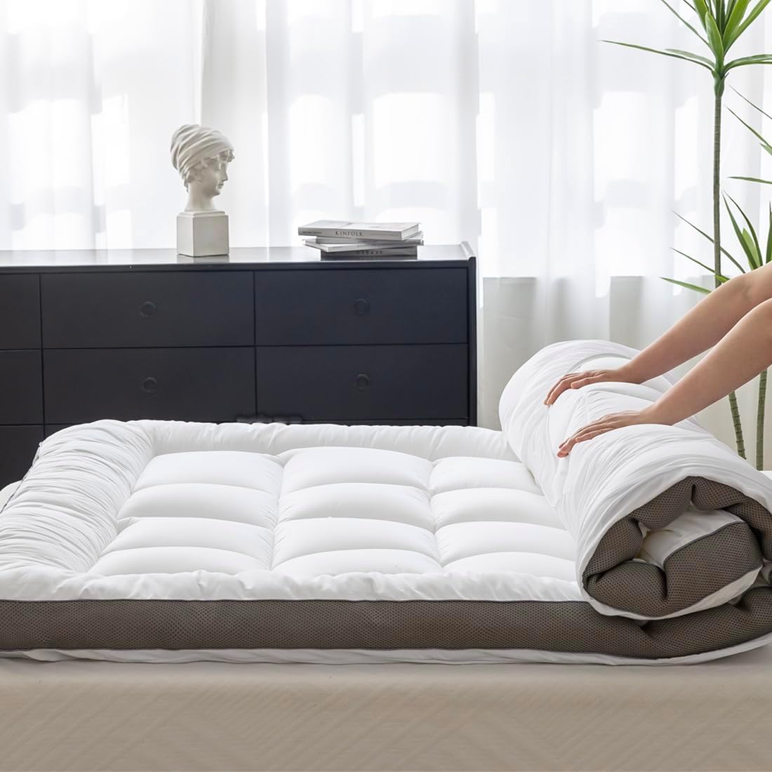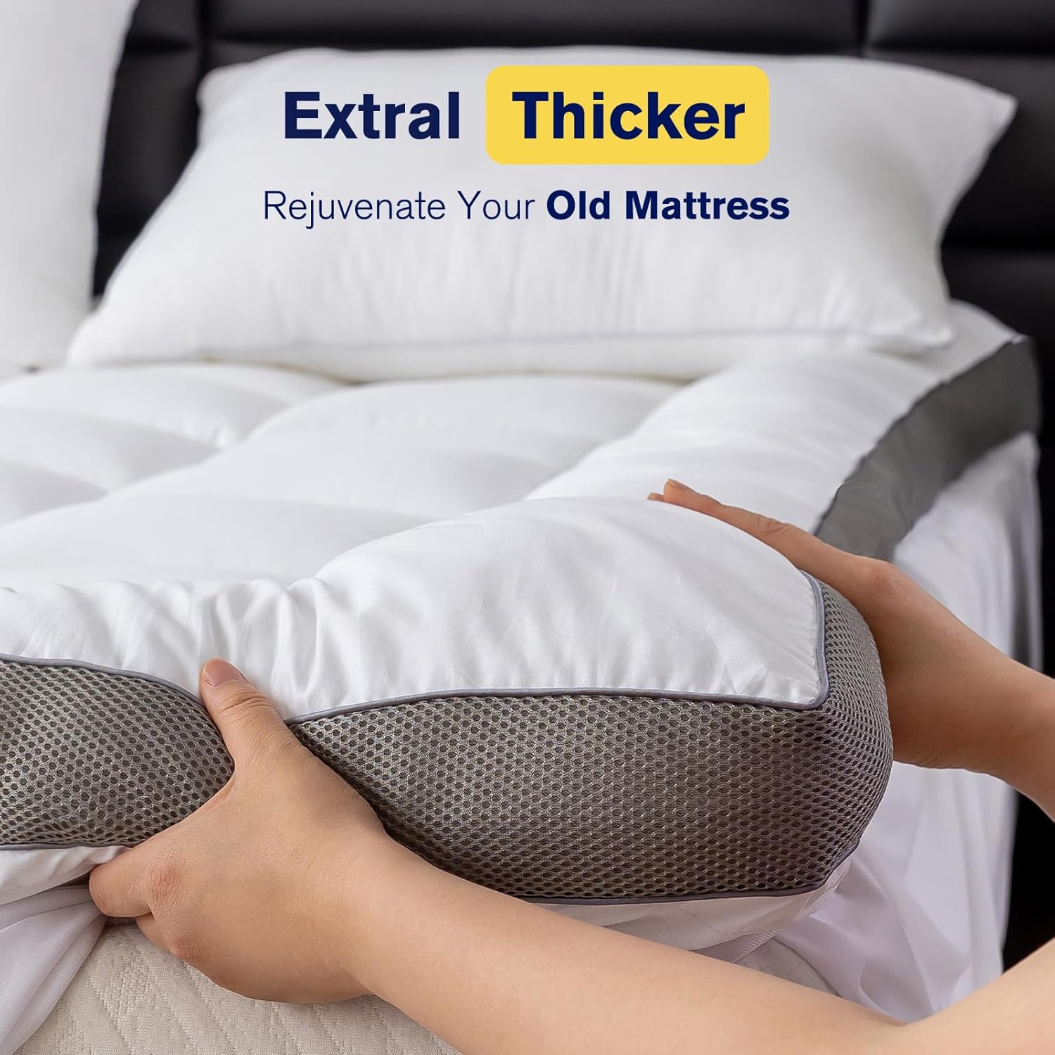 Elevate your sleep experience with the Primesoft 2" thick cotton mattress topper, designed to deliver exceptional comfort and support. Crafted with 1100gsm 3D+7D down alternative, this topper offers a luxurious feel without compromising on functionality. Its unique box design ensures the filling remains evenly distributed, maintaining a consistently soft and supportive surface throughout the night.