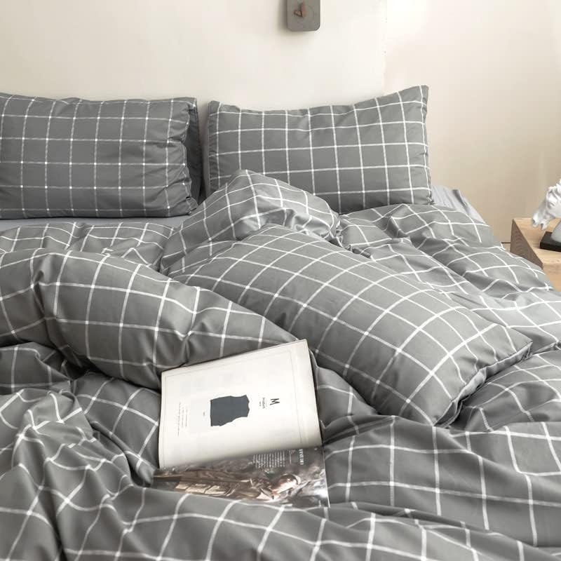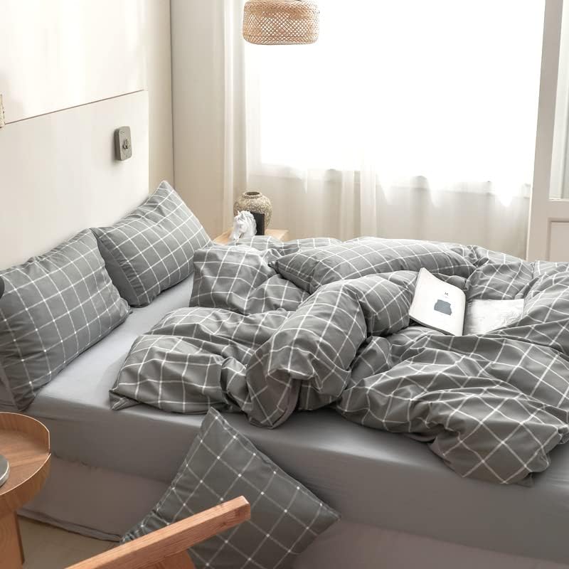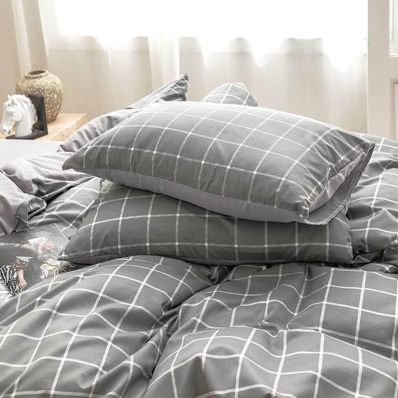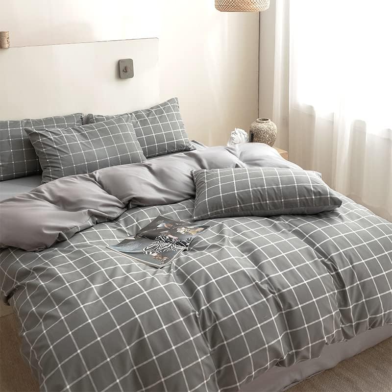 A stylish and comfortable Queen Duvet Cover Set featuring a plaid grid design. Made of soft washed microfiber for breathability and lightness. Includes 1 duvet cover and 2 pillow shams. Hidden zipper closure and corner ties for secure fit. Perfect for a cozy and restful night.