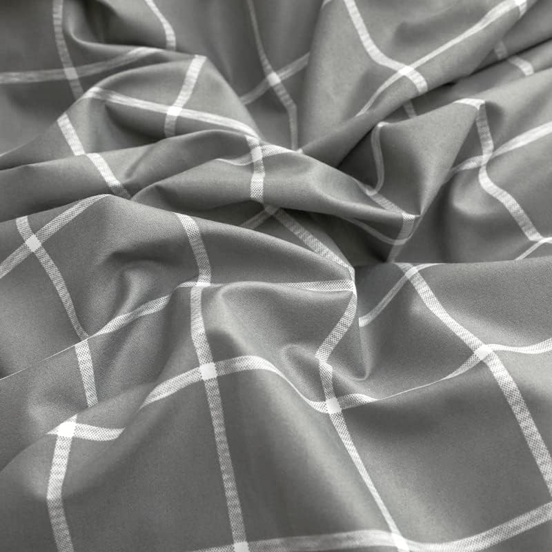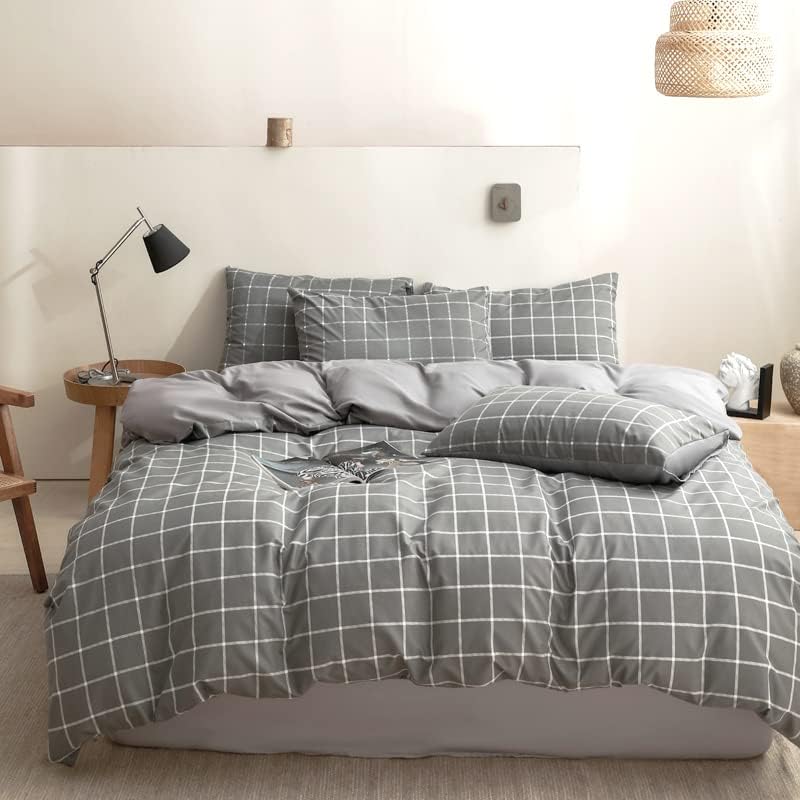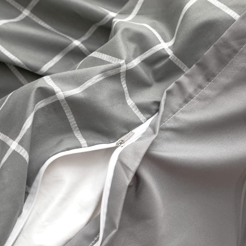 Queen Gray Duvet Cover Set with Grid Plaid Pattern