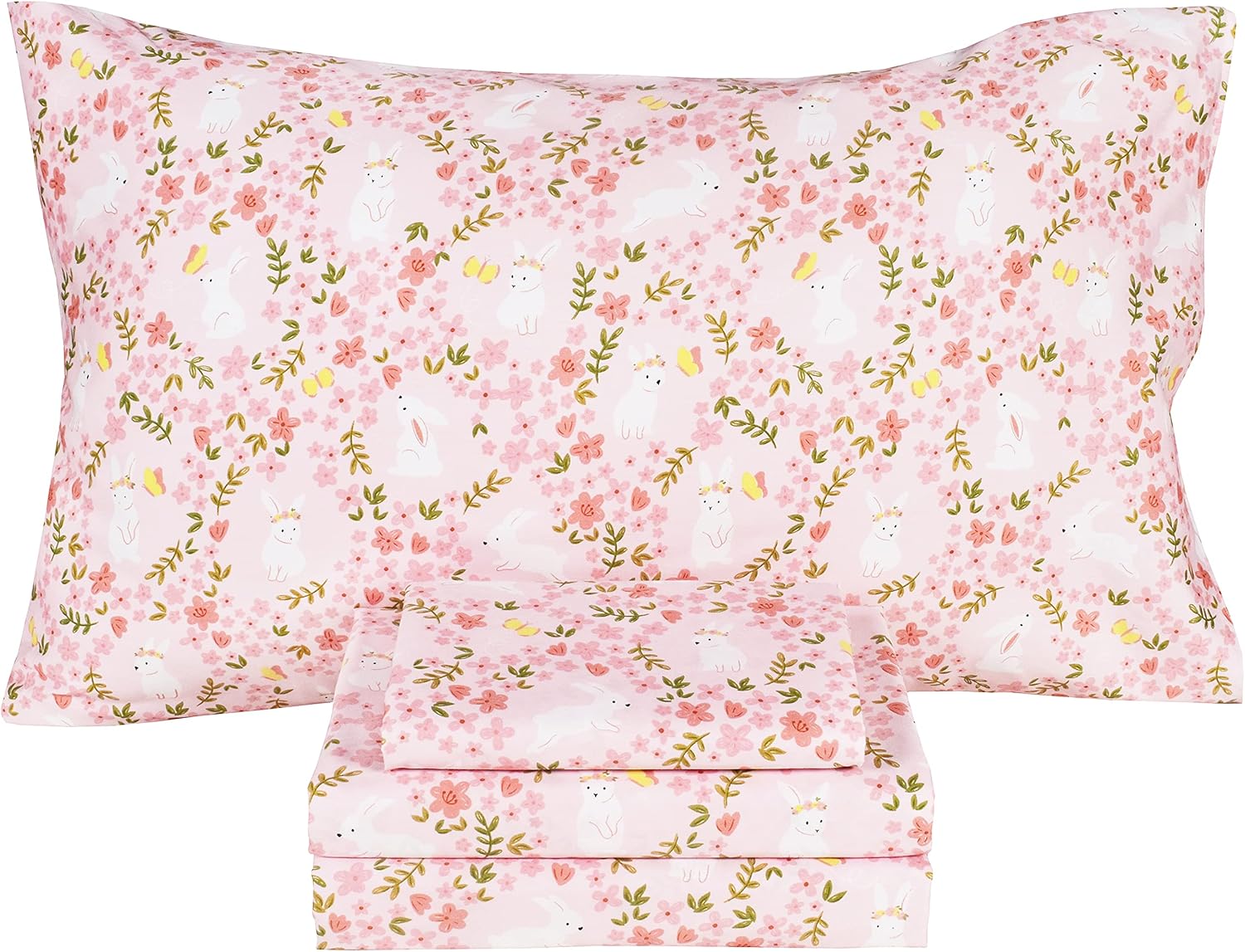 The pink flower print with a cute rabbit design brings a sense of fun and whimsy to your child's bedroom. Itâs not just a functional bedding setâitâs an invitation to create a sweet and peaceful bedtime routine.