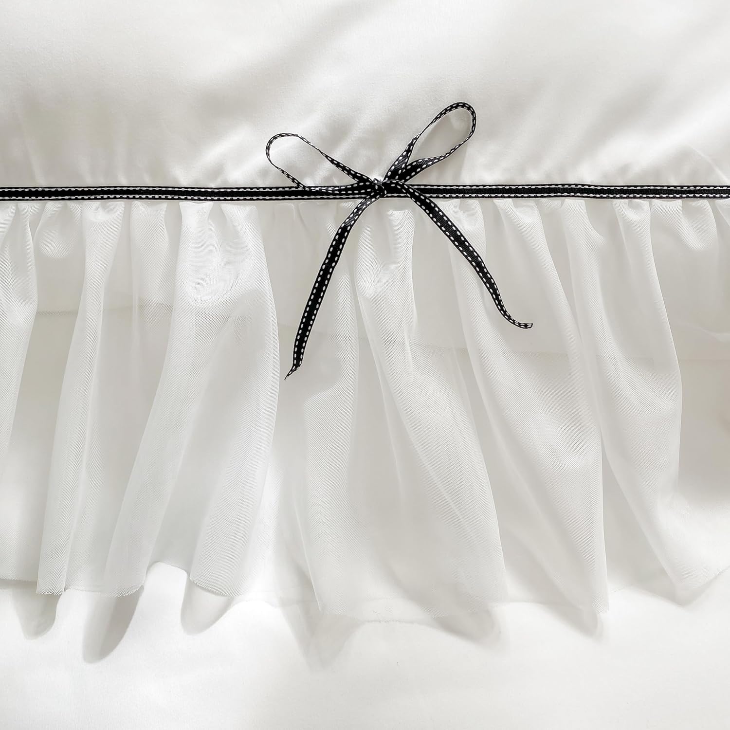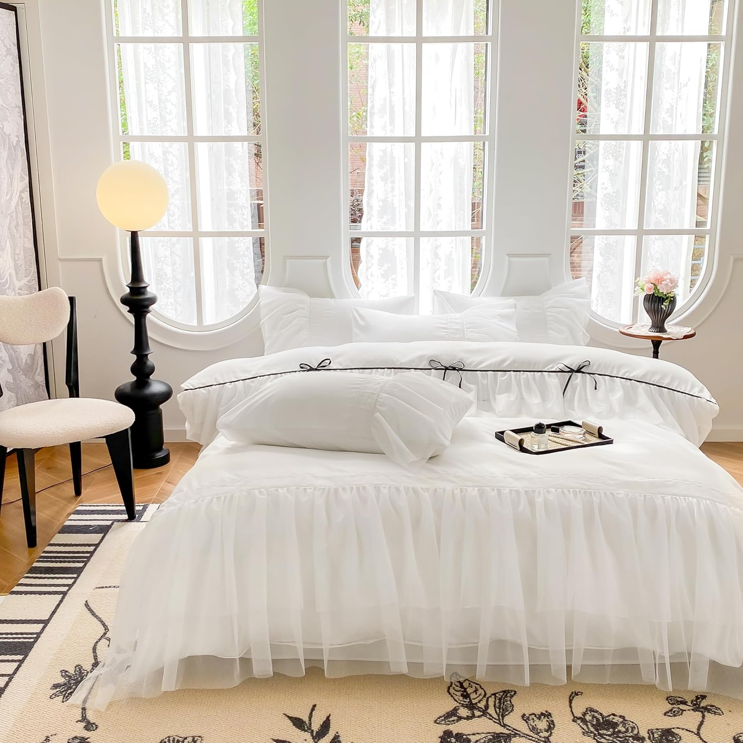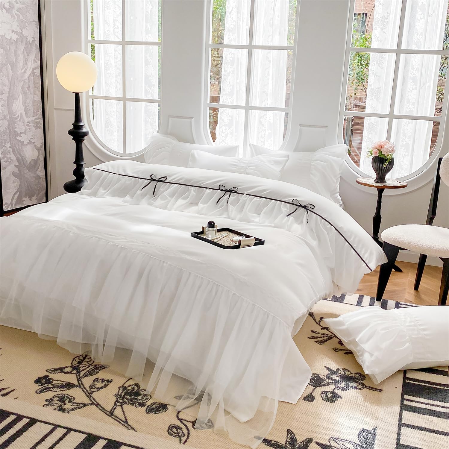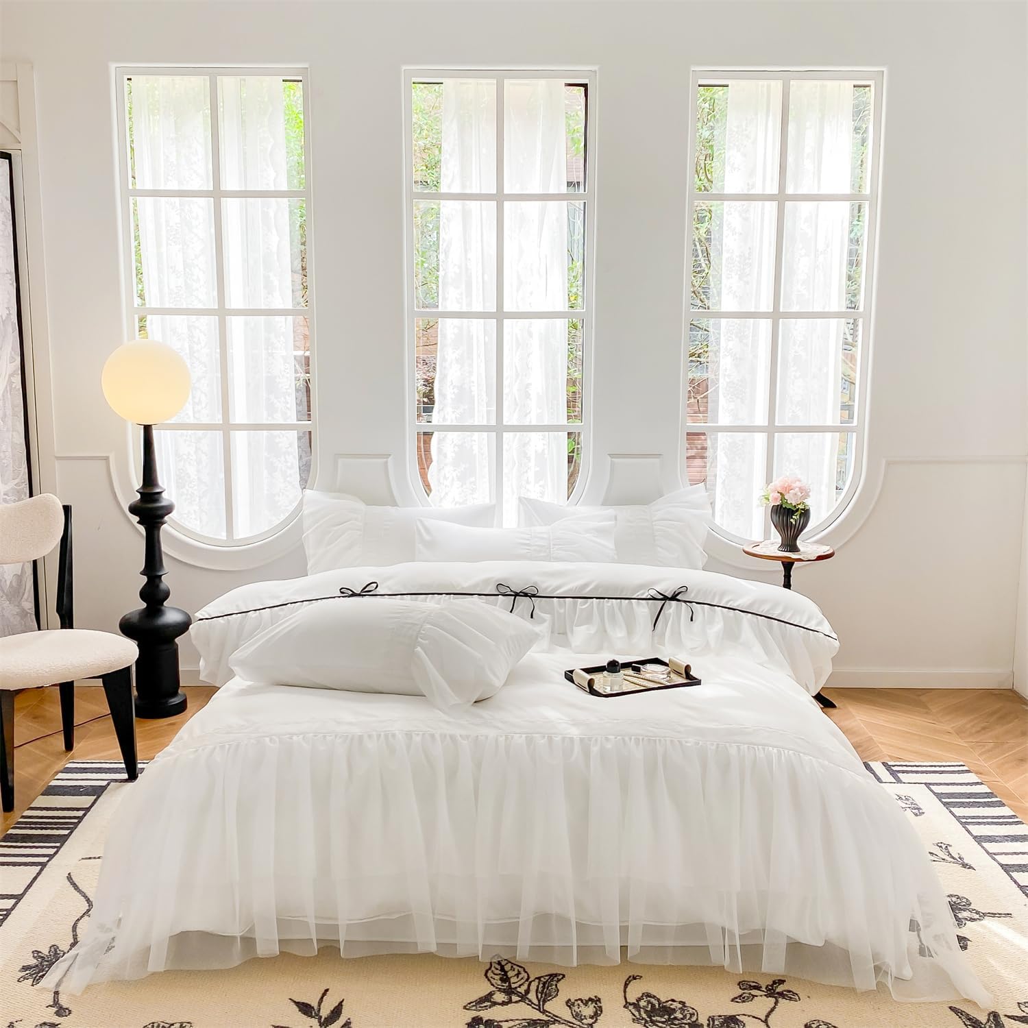 This exquisite White Lace Ruffled Queen Duvet Cover Set is more than just beddingâitâs a statement of style and comfort. The delicate lace detailing and elegant bowknot trim add a touch of sophistication that makes it perfect for any childâs room, especially for little girls or trendy kids looking for a stylish space.