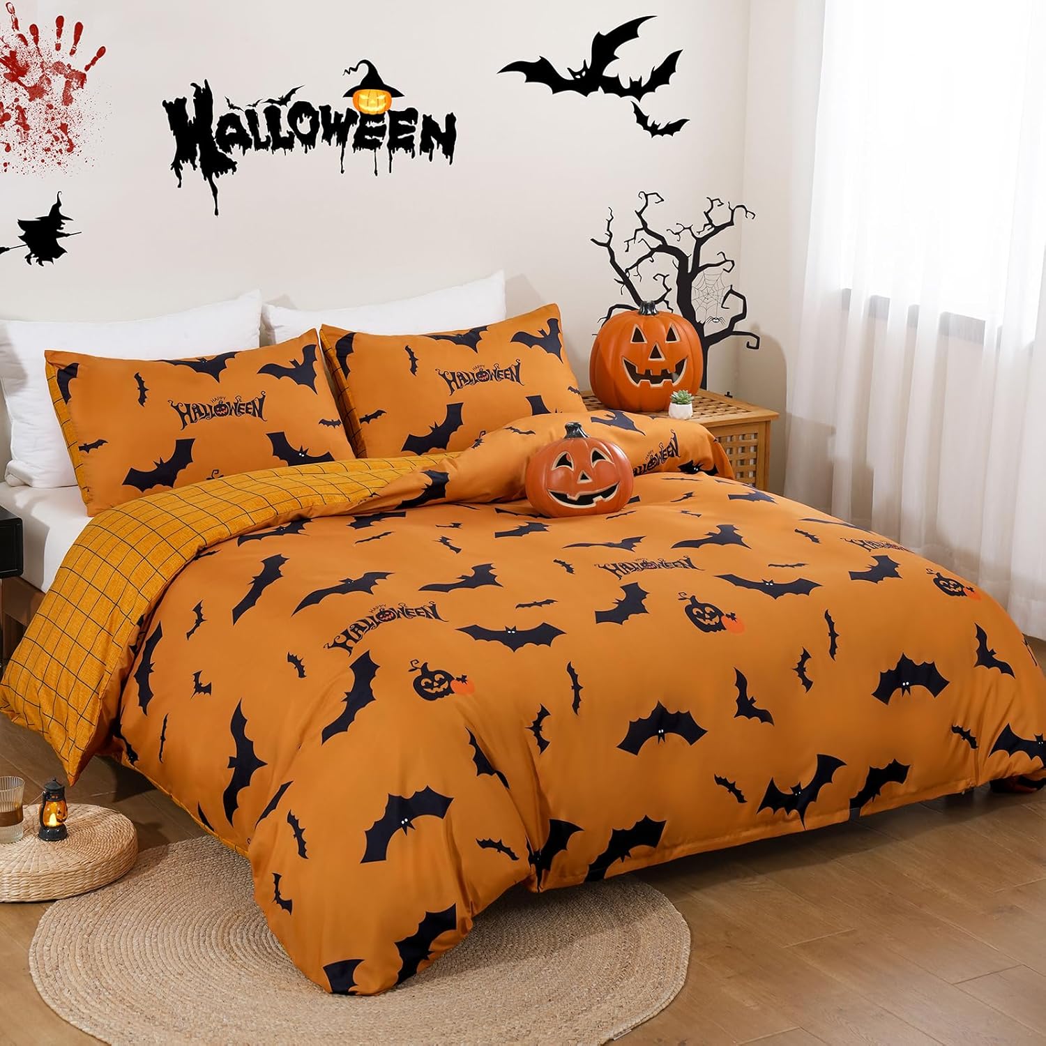 The vibrant pumpkin bat pattern is not just for looksâitâs a way to celebrate Halloween with flair. This festive design is ideal for creating a magical and spooky ambiance in your bedroom or any space in the house.